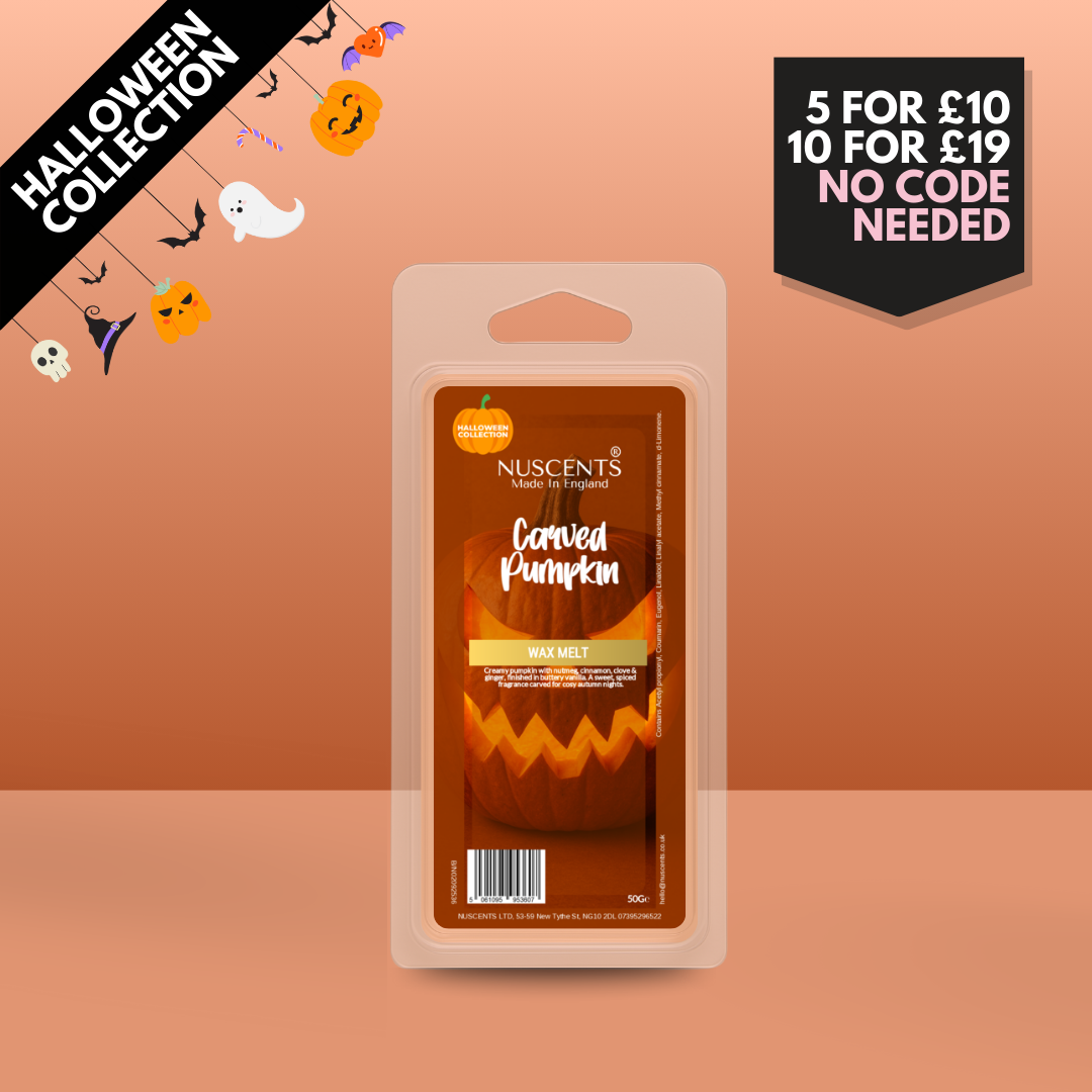 50g *Halloween Carved Pumpkin Scented Wax Melt Poured with a full 10% fragrance load for a bold throw and designed to work in both tealight burners and higher-wattage electric warmers. Made In England.
