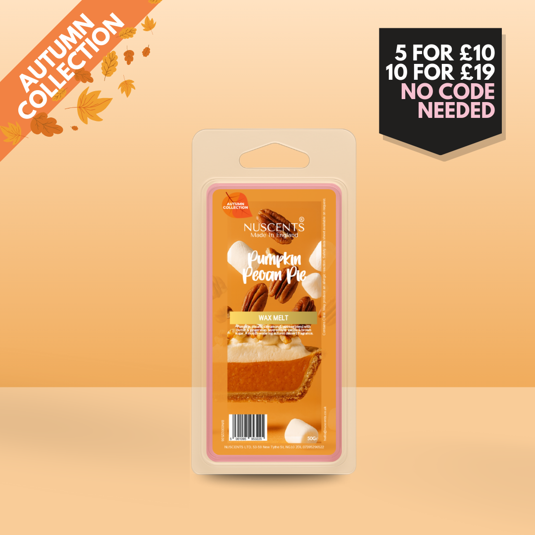 50g *AUTUMN Pumpkin Pecan Pie Scented Wax Melt Poured with a full 10% fragrance load for a bold throw and designed to work in both tealight burners and higher-wattage electric warmers. Made In England.