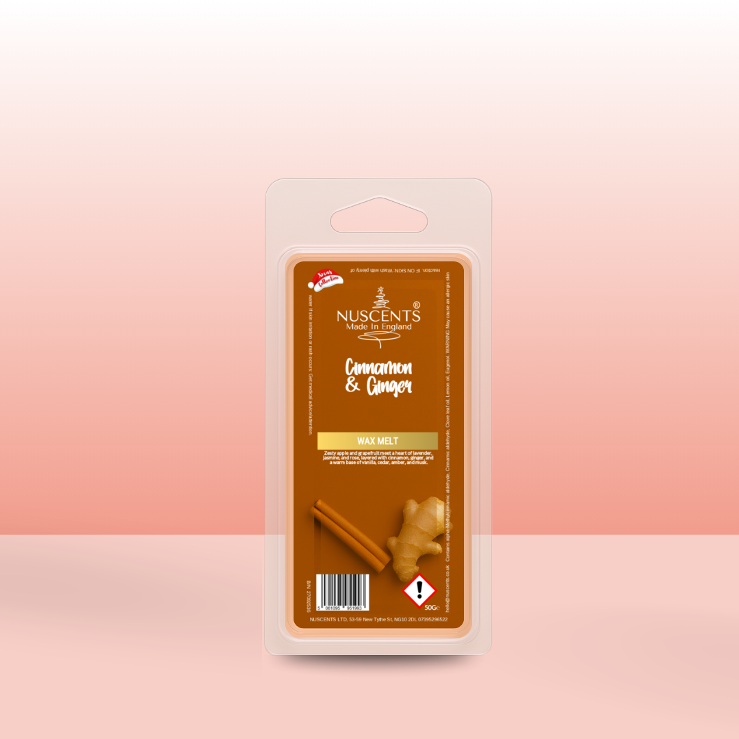 50g Cinnamon & Ginger Scented Wax Melt Poured with a full 10% fragrance load for a bold throw and designed to work in both tealight burners and higher-wattage electric warmers. Made In England.