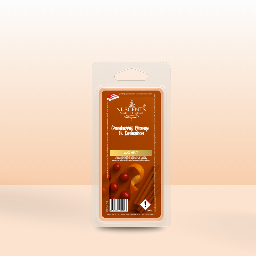 50g CHRISTMAS Cranberry, Orange & Cinnamon Scented Wax Melt Poured with a full 10% fragrance load for a bold throw and designed to work in both tealight burners and higher-wattage electric warmers. Made In England.