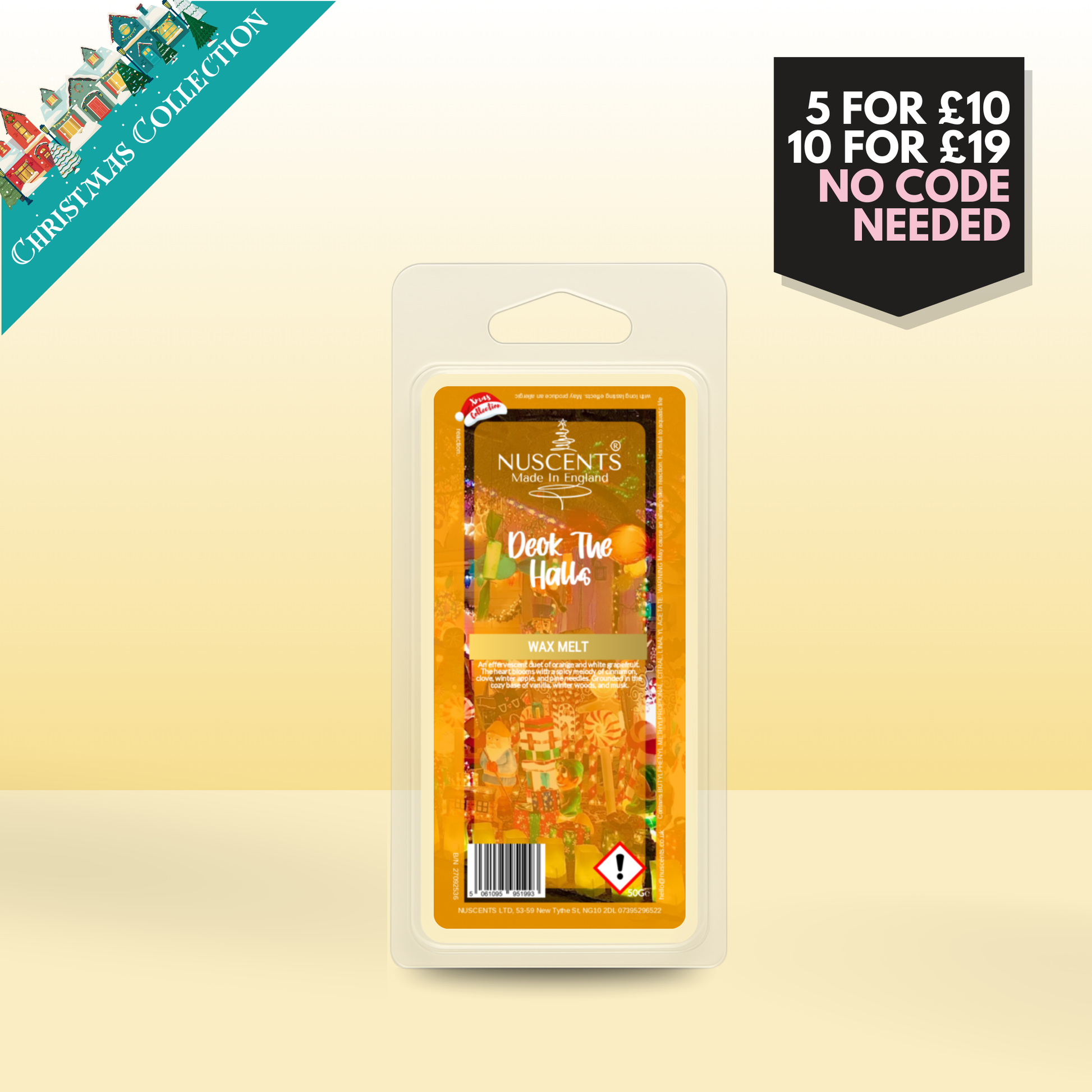 50g Deck The Halls Scented Wax Melt Poured with a full 10% fragrance load for a bold throw and designed to work in both tealight burners and higher-wattage electric warmers. Made In England.