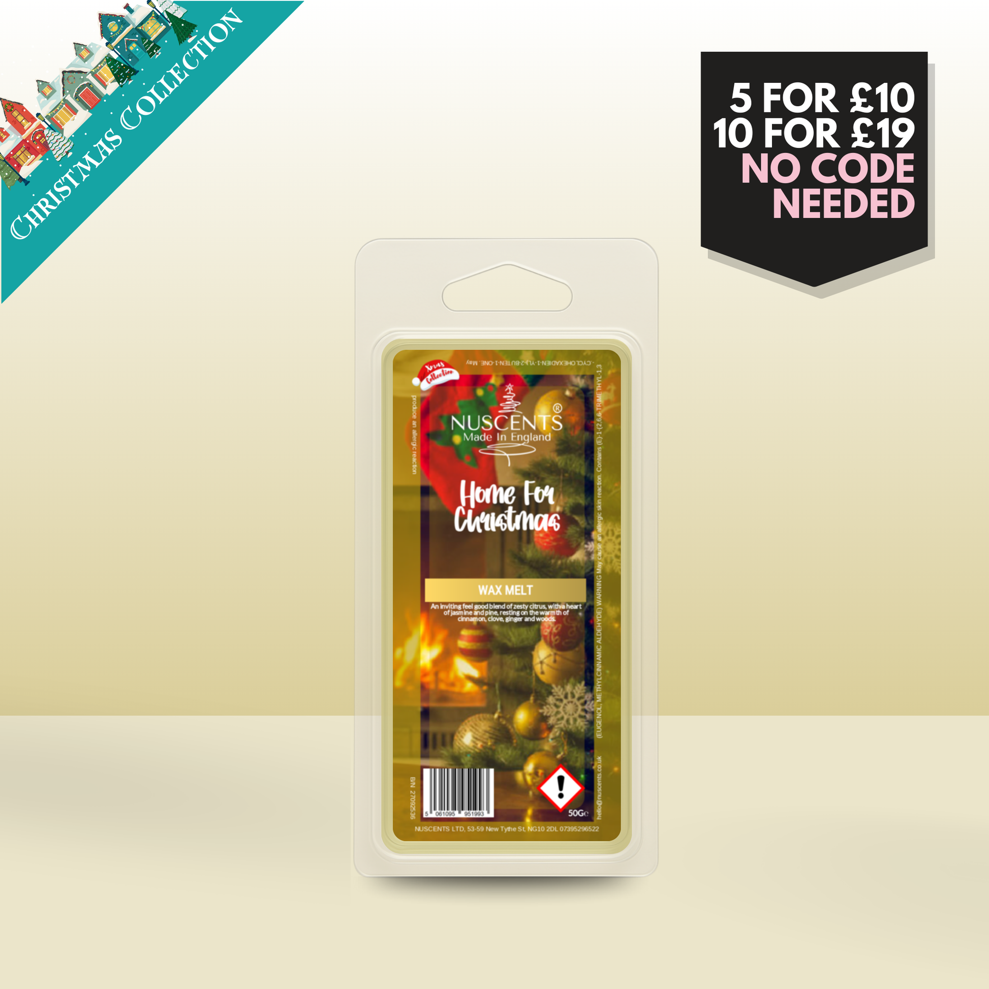 50g Home For Christmas Scented Wax Melt Poured with a full 10% fragrance load for a bold throw and designed to work in both tealight burners and higher-wattage electric warmers. Made In England.
