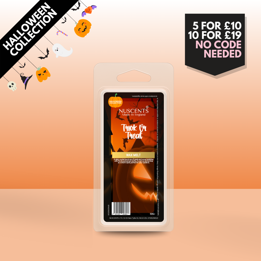 50g *Halloween Trick Or Treat Scented Wax Melt Poured with a full 10% fragrance load for a bold throw and designed to work in both tealight burners and higher-wattage electric warmers. Made In England.