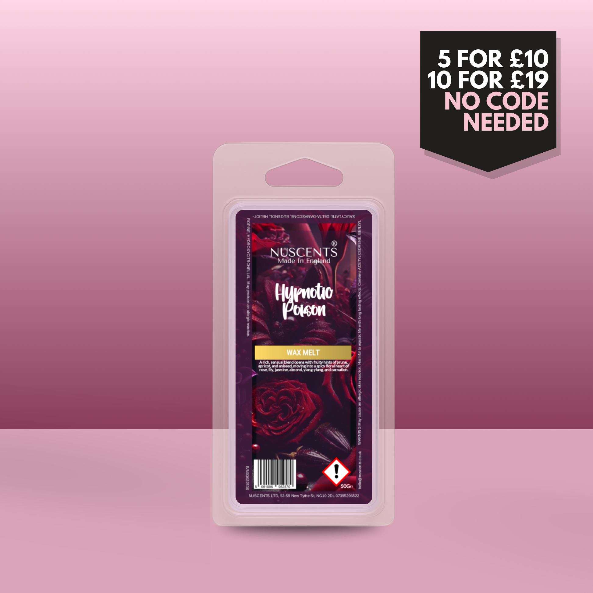 50g *LAST CHANCE Hypnotic Poison Scented Wax Melt Poured with a full 10% fragrance load for a bold throw and designed to work in both tealight burners and higher-wattage electric warmers. Made In England.