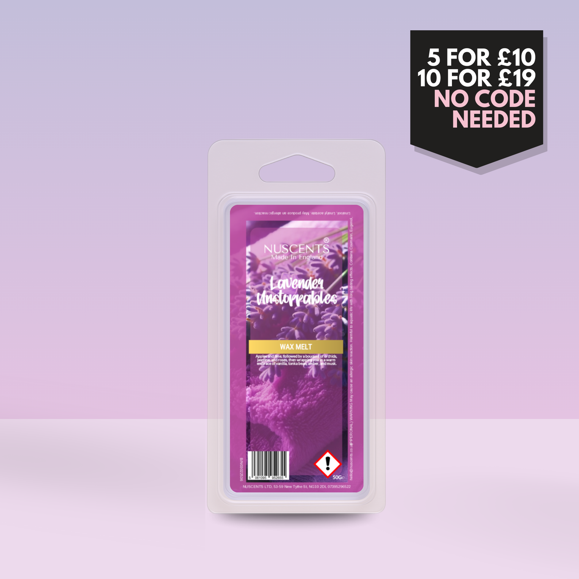 50g Lavender Unstoppables Scented Wax Melt Poured with a full 10% fragrance load for a bold throw and designed to work in both tealight burners and higher-wattage electric warmers. Made In England.