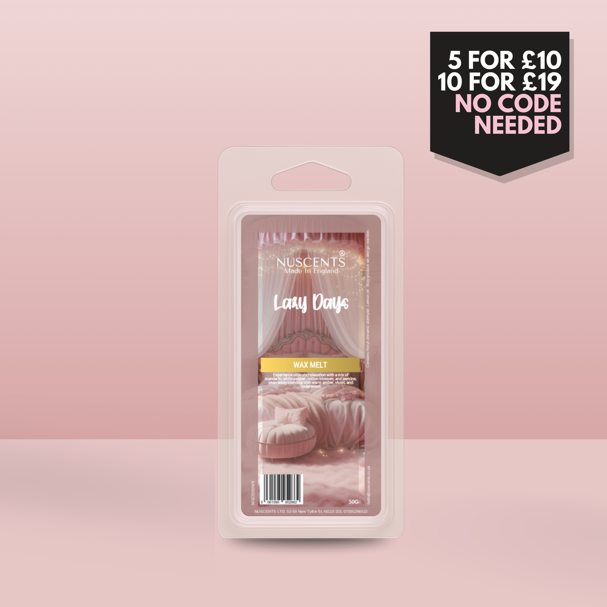 50g *LAST CHANCE Lazy Days Scented Wax Melt Poured with a full 10% fragrance load for a bold throw and designed to work in both tealight burners and higher-wattage electric warmers. Made In England.