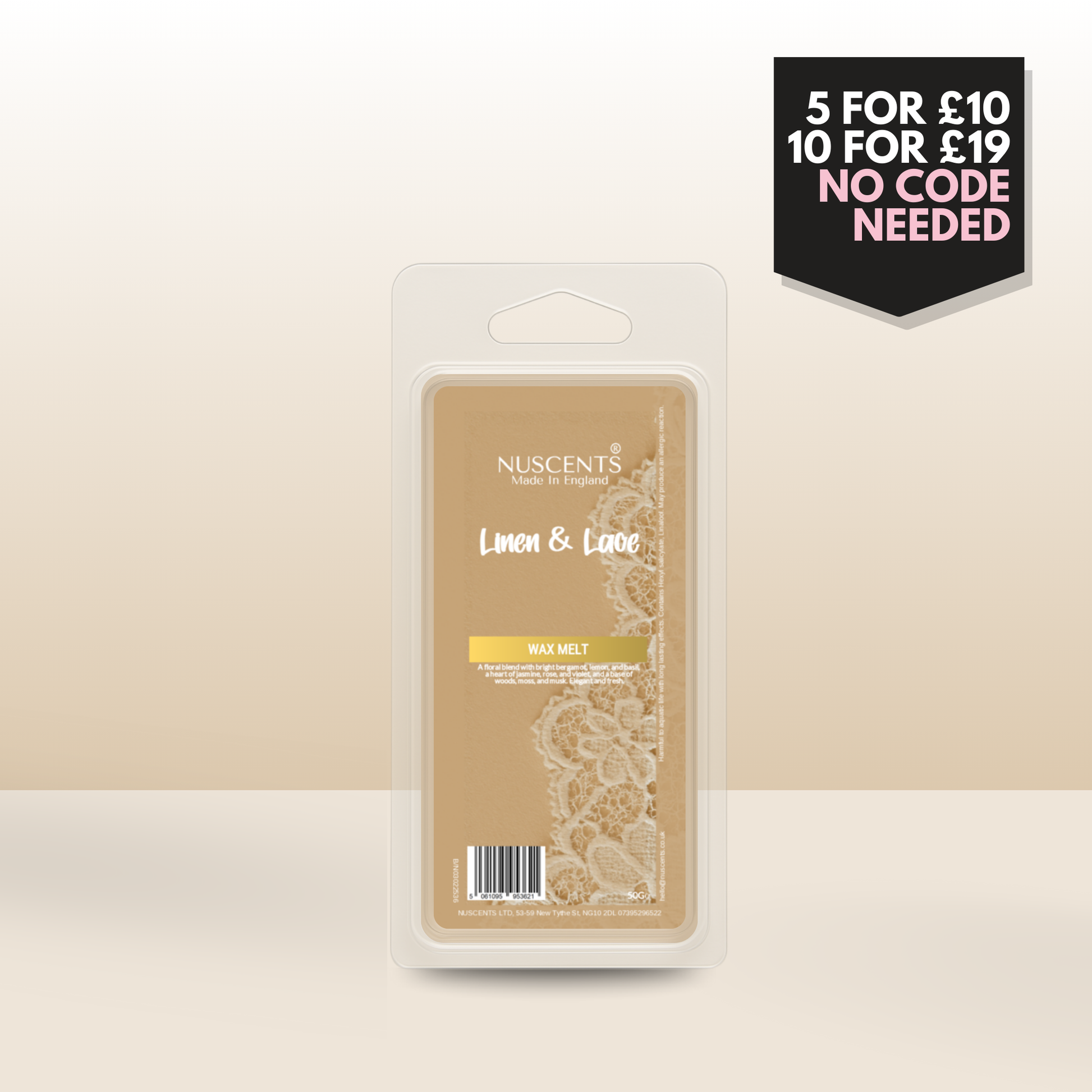 50g *LAST CHANCE Linen & Lace Scented Wax Melt Poured with a full 10% fragrance load for a bold throw and designed to work in both tealight burners and higher-wattage electric warmers. Made In England.