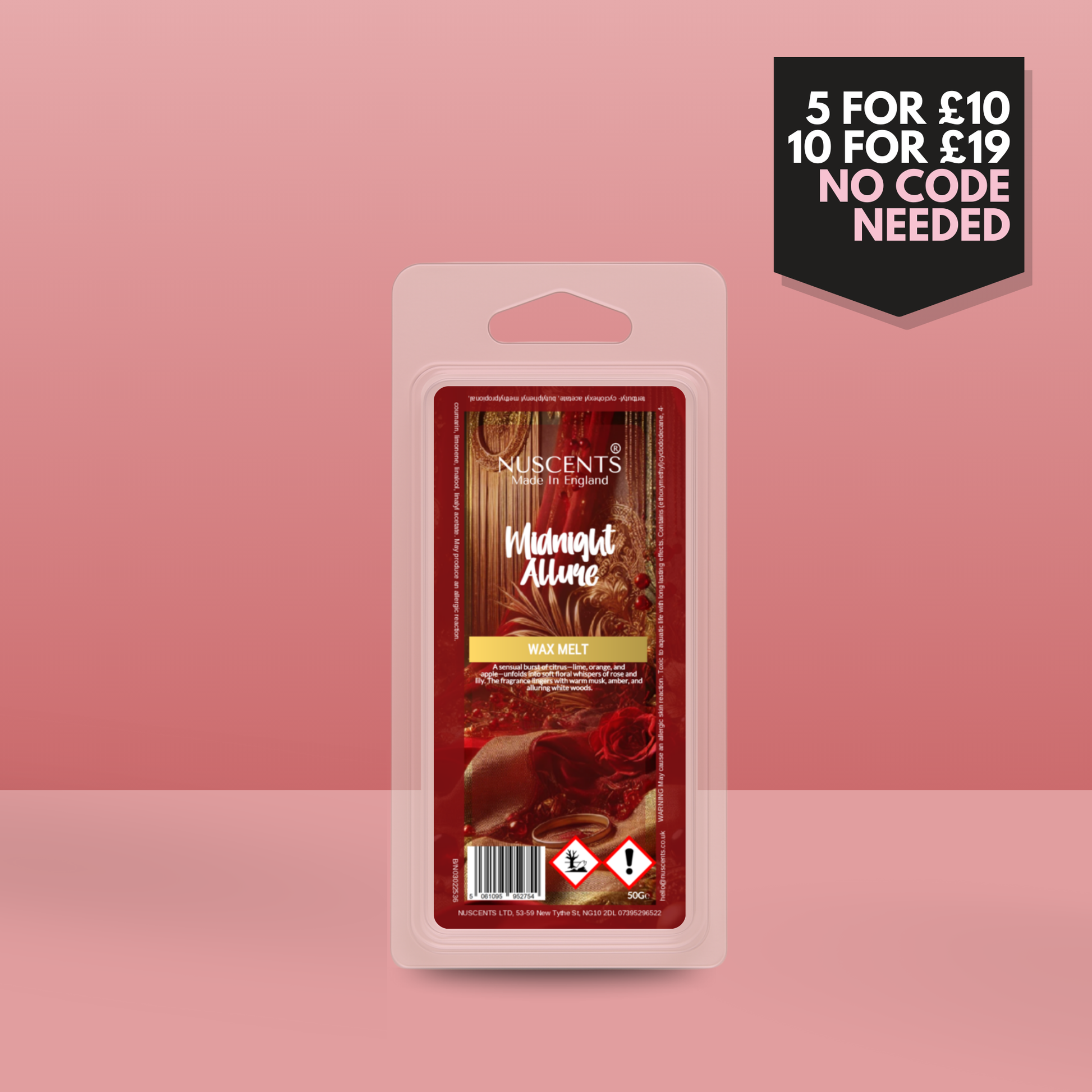 50g *LAST CHANCE Midnight Allure Scented Wax Melt Poured with a full 10% fragrance load for a bold throw and designed to work in both tealight burners and higher-wattage electric warmers. Made In England.