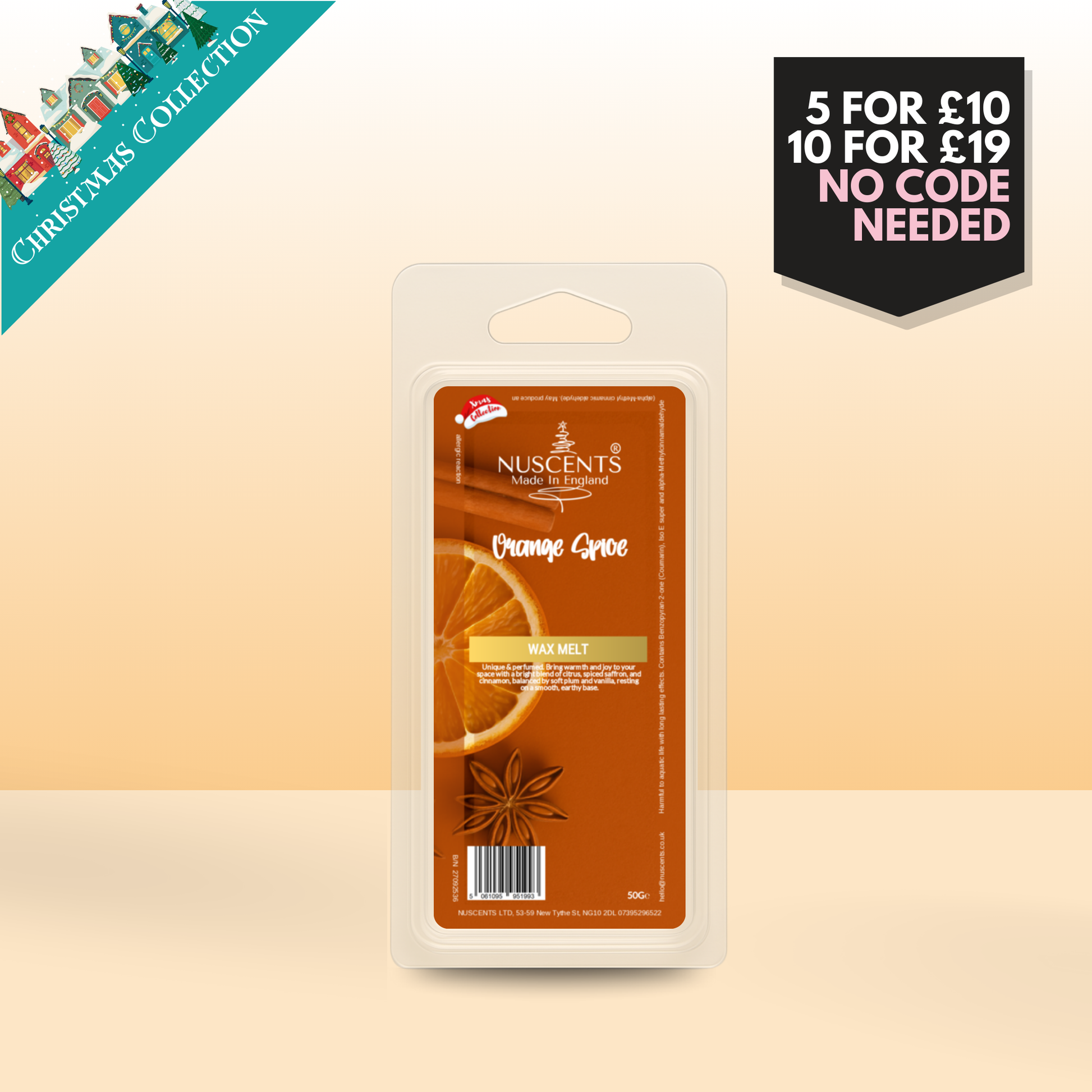50g Orange Spice Scented Wax Melt Poured with a full 10% fragrance load for a bold throw and designed to work in both tealight burners and higher-wattage electric warmers. Made In England.