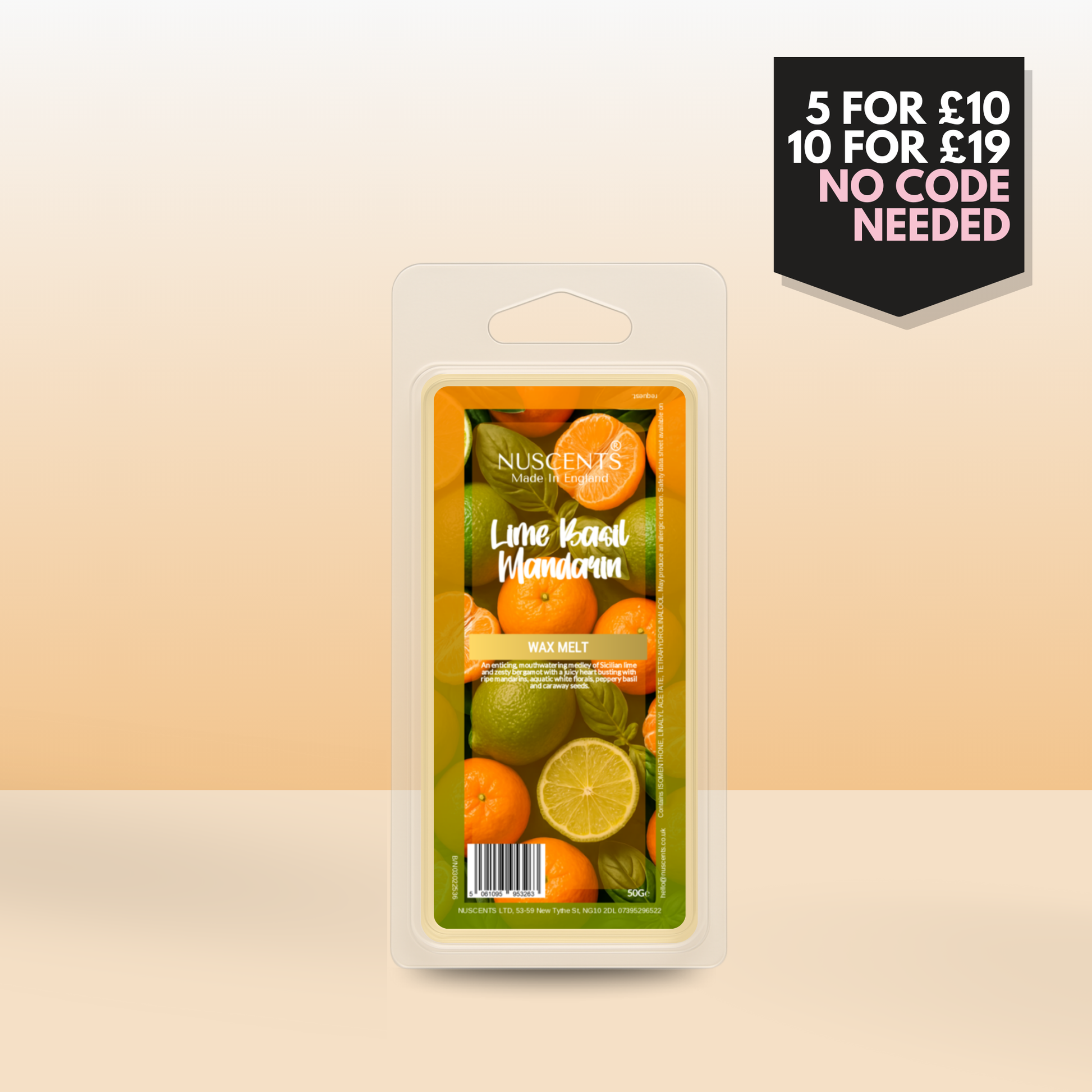 50g Lime Basil Mandarin Scented Wax Melt Poured with a full 10% fragrance load for a bold throw and designed to work in both tealight burners and higher-wattage electric warmers. Made In England.
