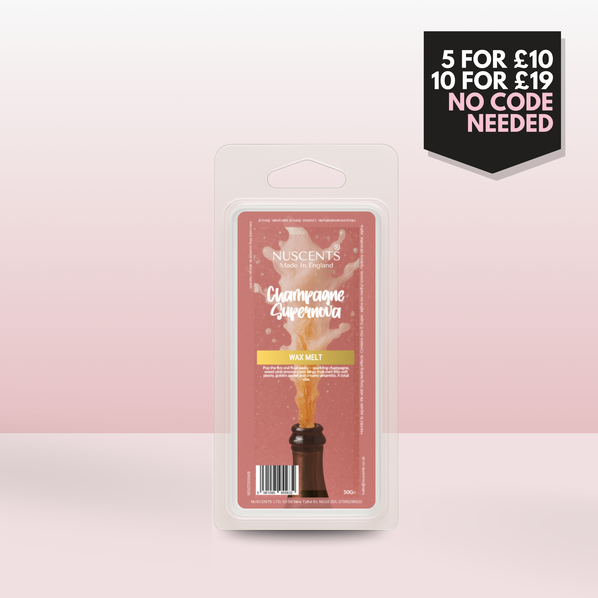 50g *NEW Champagne Supernova Scented Wax Melt Poured with a full 10% fragrance load for a bold throw and designed to work in both tealight burners and higher-wattage electric warmers. Made In England.
