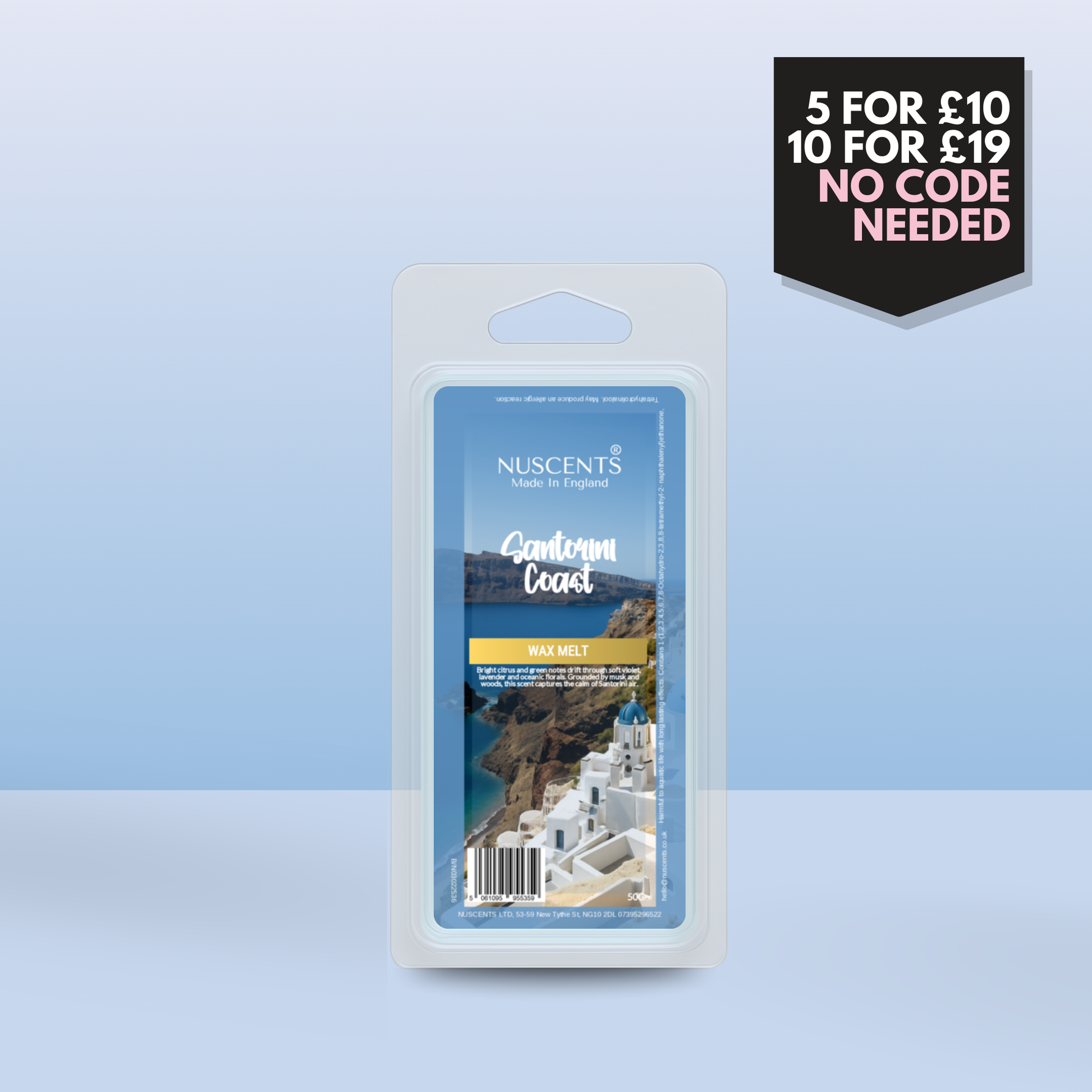 50g *NEW Santorini Coast Scented Wax Melt Poured with a full 10% fragrance load for a bold throw and designed to work in both tealight burners and higher-wattage electric warmers. Made In England.