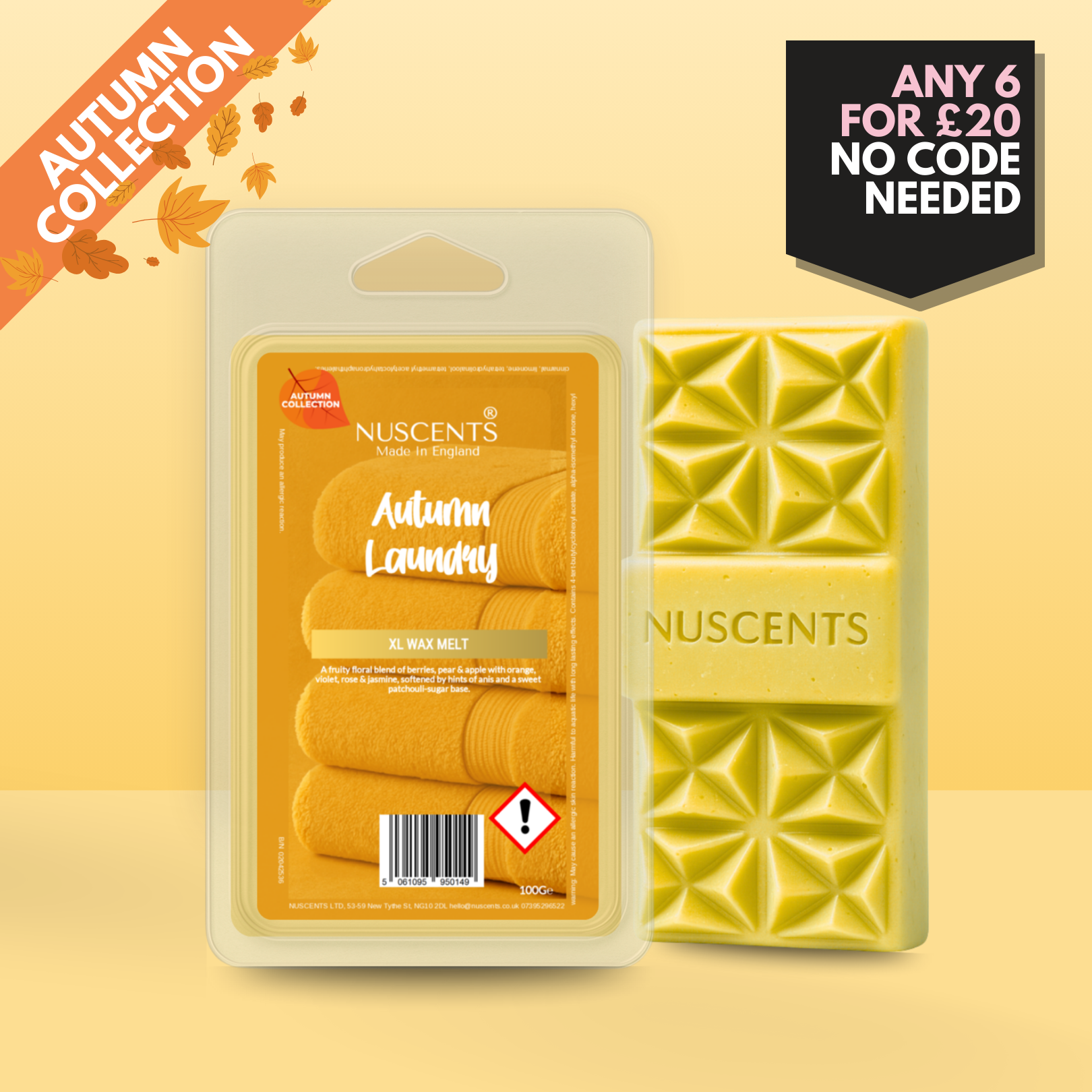 *AUTUMN Autumn Laundry Wax Melt 100g XL A generous 100g wax melt - around twice the size of a standard wax melt - for incredible value and lasting fragrance. Contains multiple segments and large centrepiece wax chunk suitable for large wax warmers. Suitable for both tealight burners and higher-wattage electric warmers, each XL is poured with a full 10% fragrance load to give a strong, room-filling scent. The higher melting temperature ensures a slower release, so whilst early release is slower, you enjoy hours of fragrance from every piece.