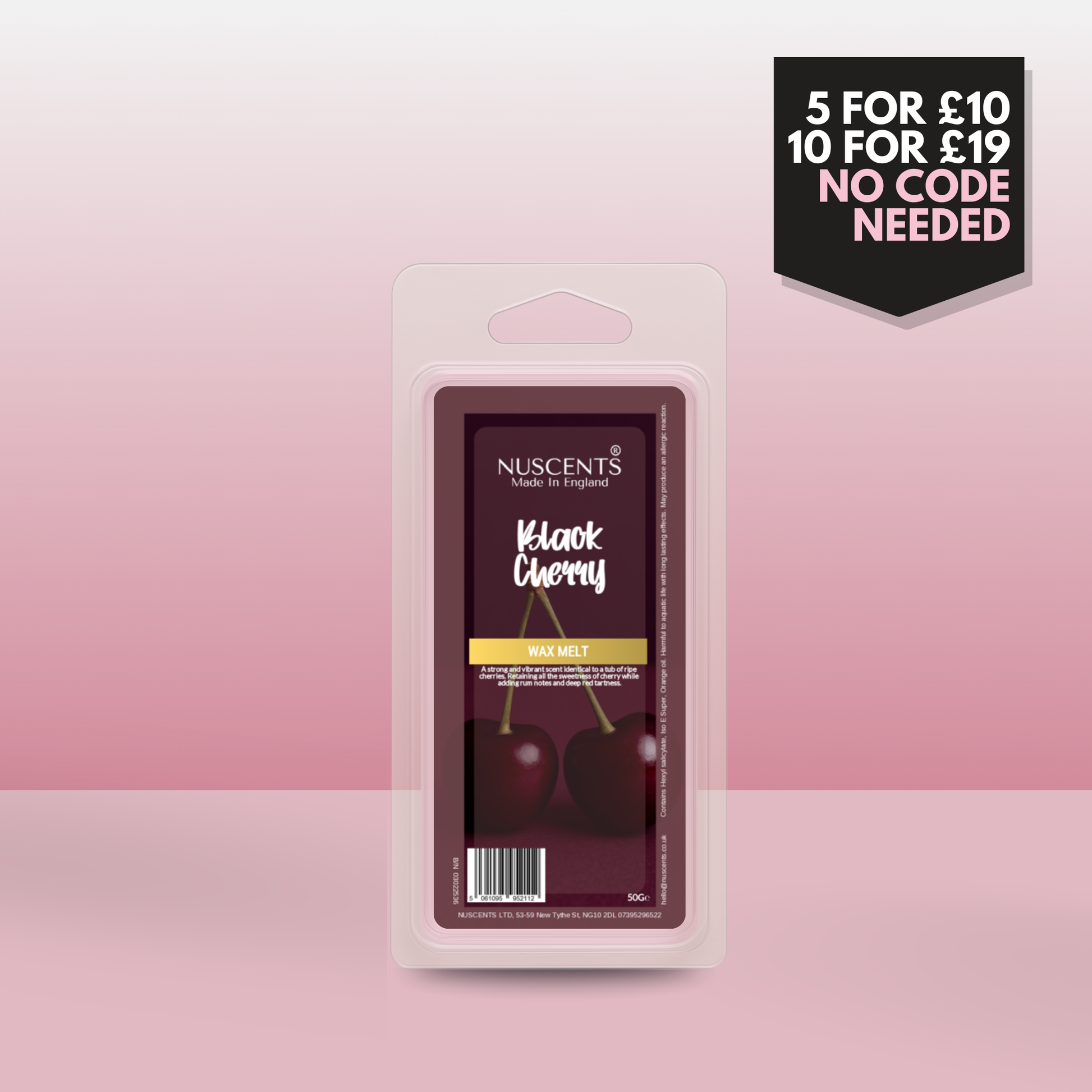 50g Black Cherry Scented Wax Melt Poured with a full 10% fragrance load for a bold throw and designed to work in both tealight burners and higher-wattage electric warmers. Made In England.