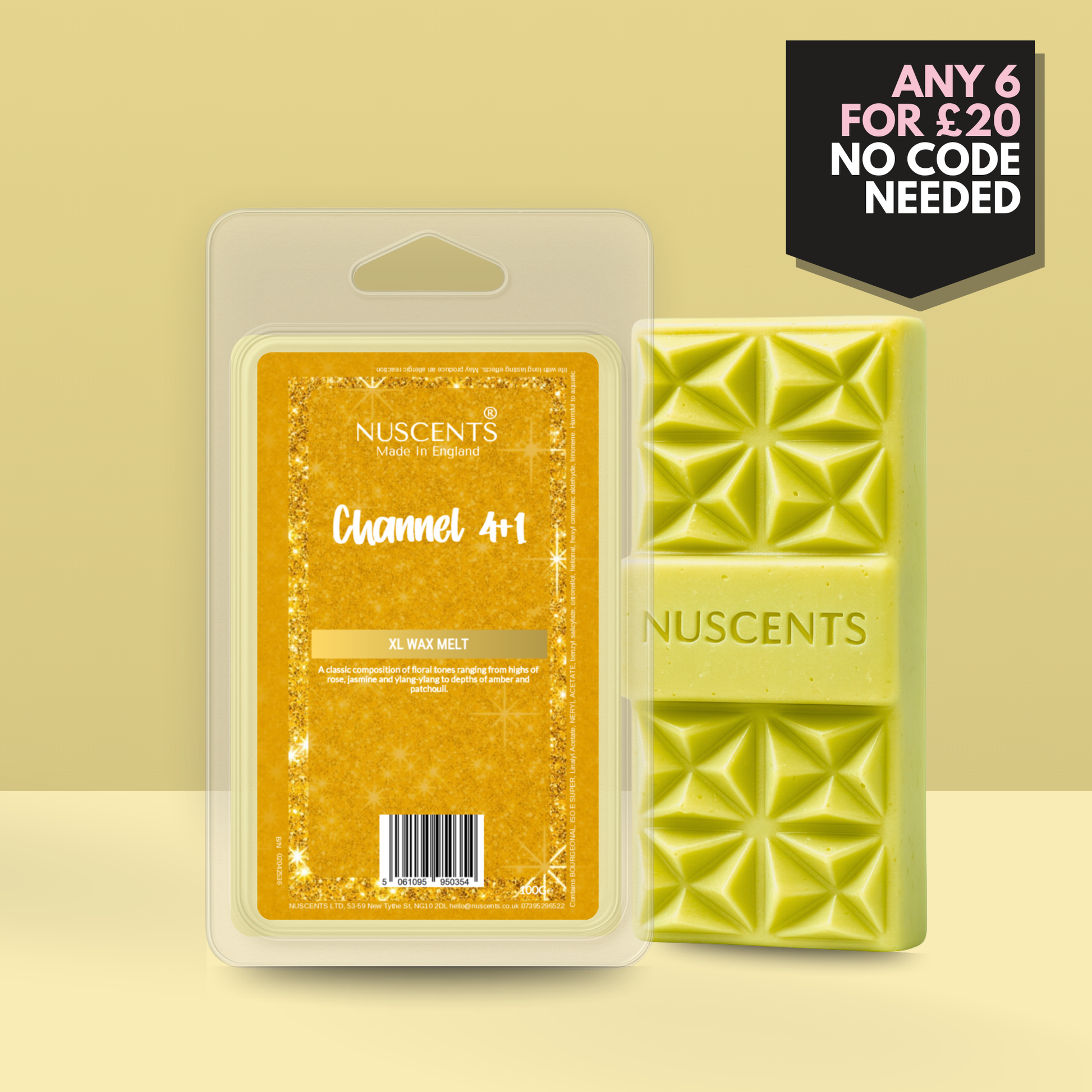 Channel 4+1 Wax Melt 100g XL A generous 100g wax melt - around twice the size of a standard wax melt - for incredible value and lasting fragrance. Contains multiple segments and large centrepiece wax chunk suitable for large wax warmers. Suitable for both tealight burners and higher-wattage electric warmers, each XL is poured with a full 10% fragrance load to give a strong, room-filling scent. The higher melting temperature ensures a slower release, so whilst early release is slower, you enjoy hours of fragrance from every piece.