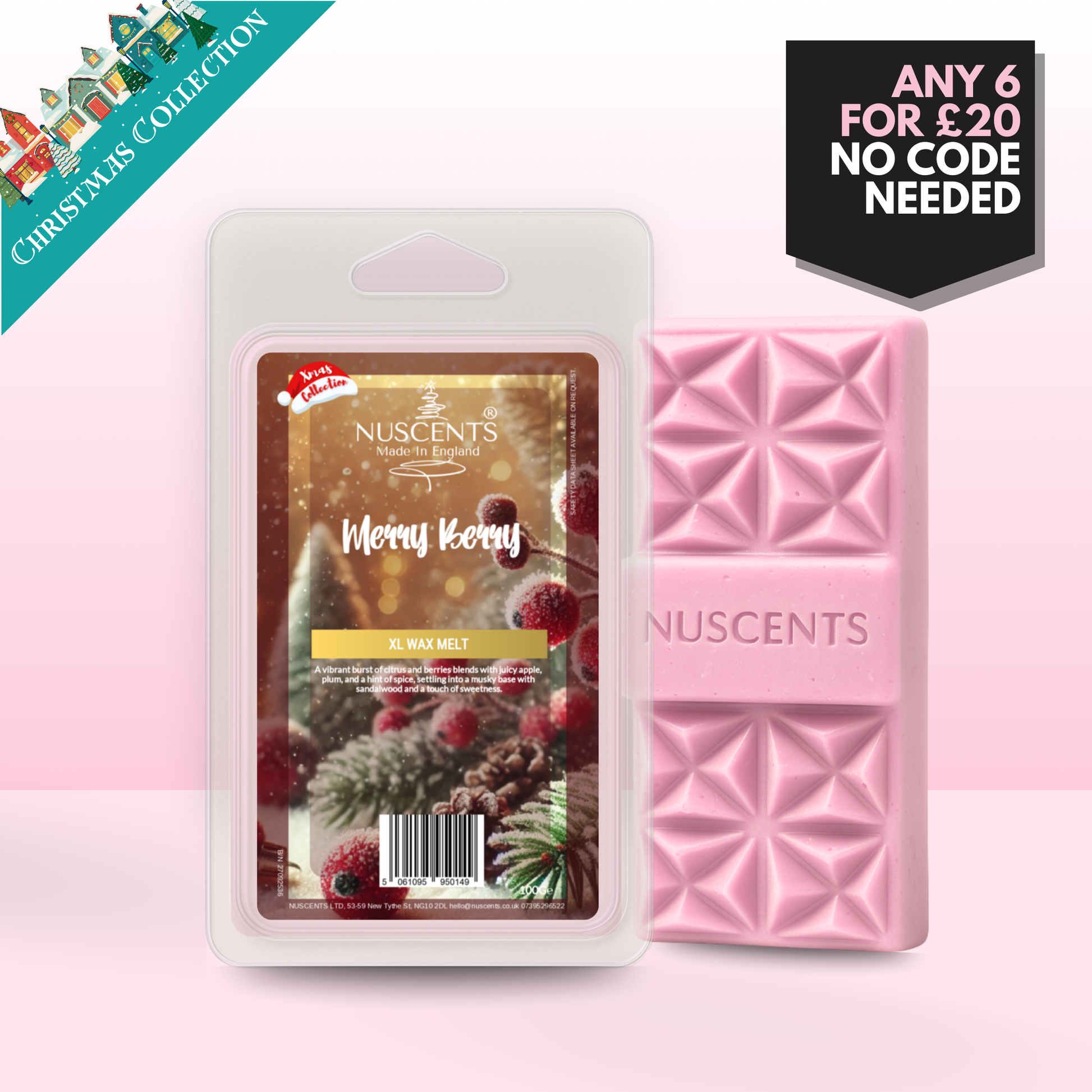Merry Berry Wax Melt 100g XL A generous 100g wax melt - around twice the size of a standard wax melt - for incredible value and lasting fragrance. Contains multiple segments and large centrepiece wax chunk suitable for large wax warmers. Suitable for both tealight burners and higher-wattage electric warmers, each XL is poured with a full 10% fragrance load to give a strong, room-filling scent. The higher melting temperature ensures a slower release, so whilst early release is slower, you enjoy hours of fragrance from every piece.