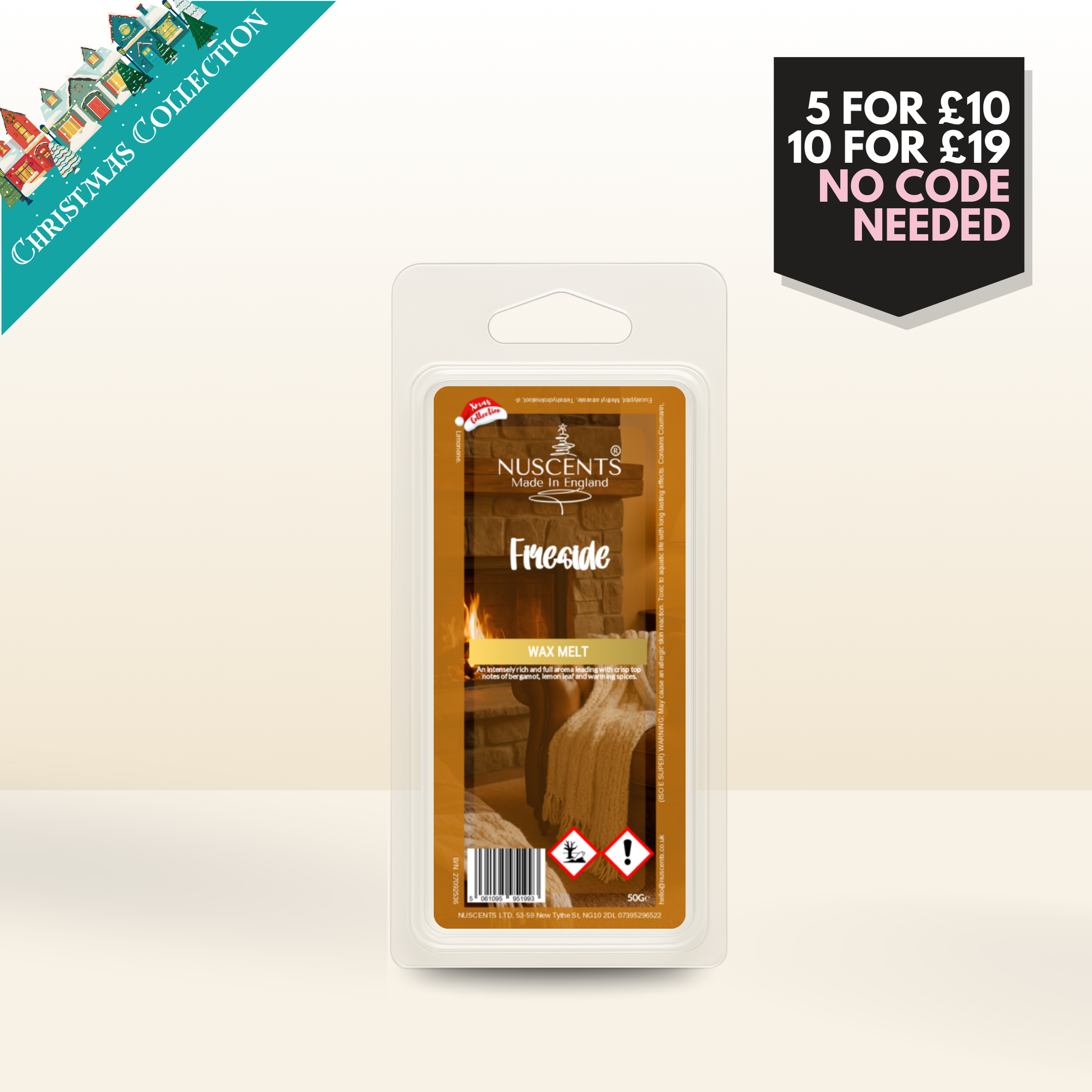 50g Fireside Scented Wax Melt Poured with a full 10% fragrance load for a bold throw and designed to work in both tealight burners and higher-wattage electric warmers. Made In England.