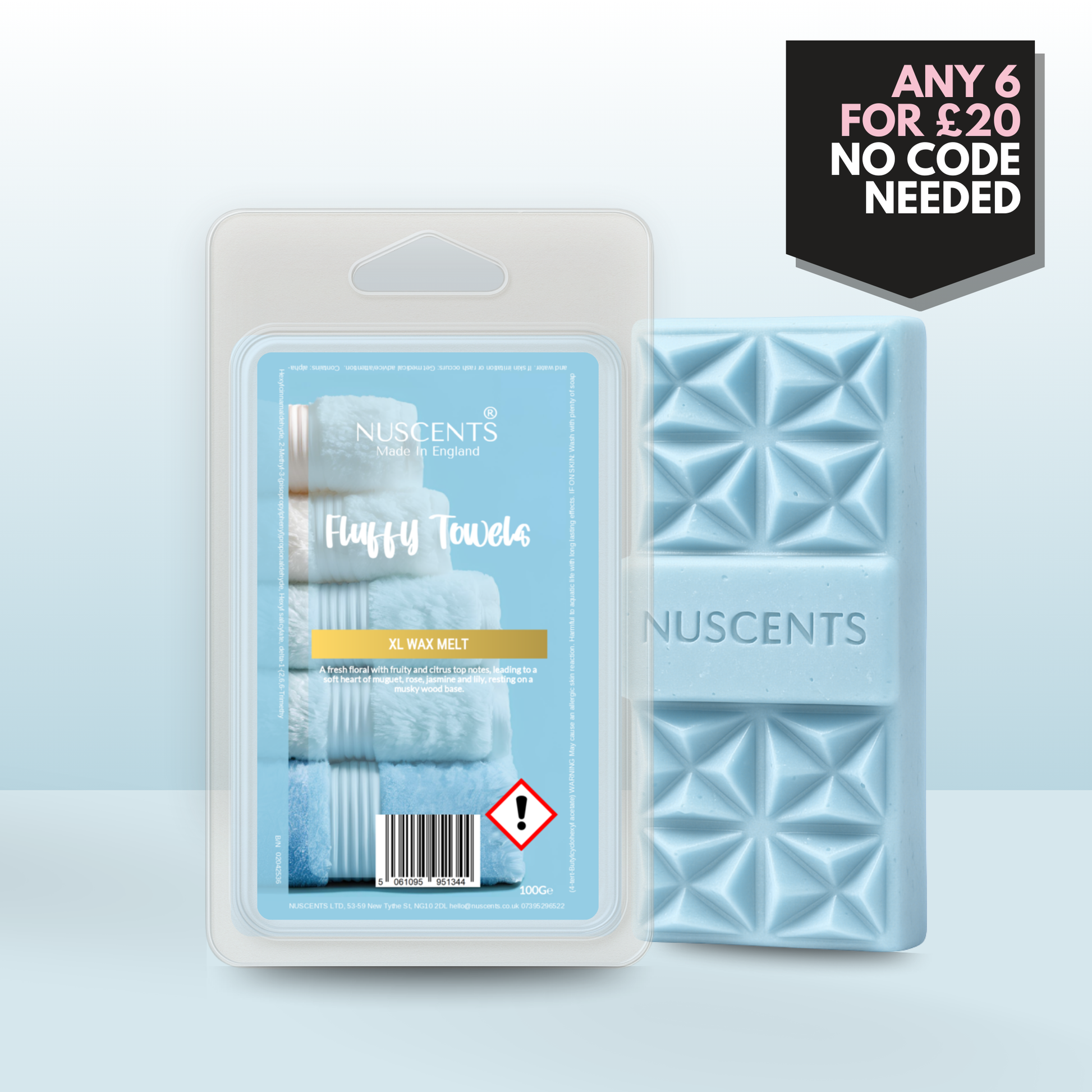 Fluffy Towels Wax Melt 100g XL A generous 100g wax melt - around twice the size of a standard wax melt - for incredible value and lasting fragrance. Contains multiple segments and large centrepiece wax chunk suitable for large wax warmers. Suitable for both tealight burners and higher-wattage electric warmers, each XL is poured with a full 10% fragrance load to give a strong, room-filling scent. The higher melting temperature ensures a slower release, so whilst early release is slower, you enjoy hours of fragrance from every piece.