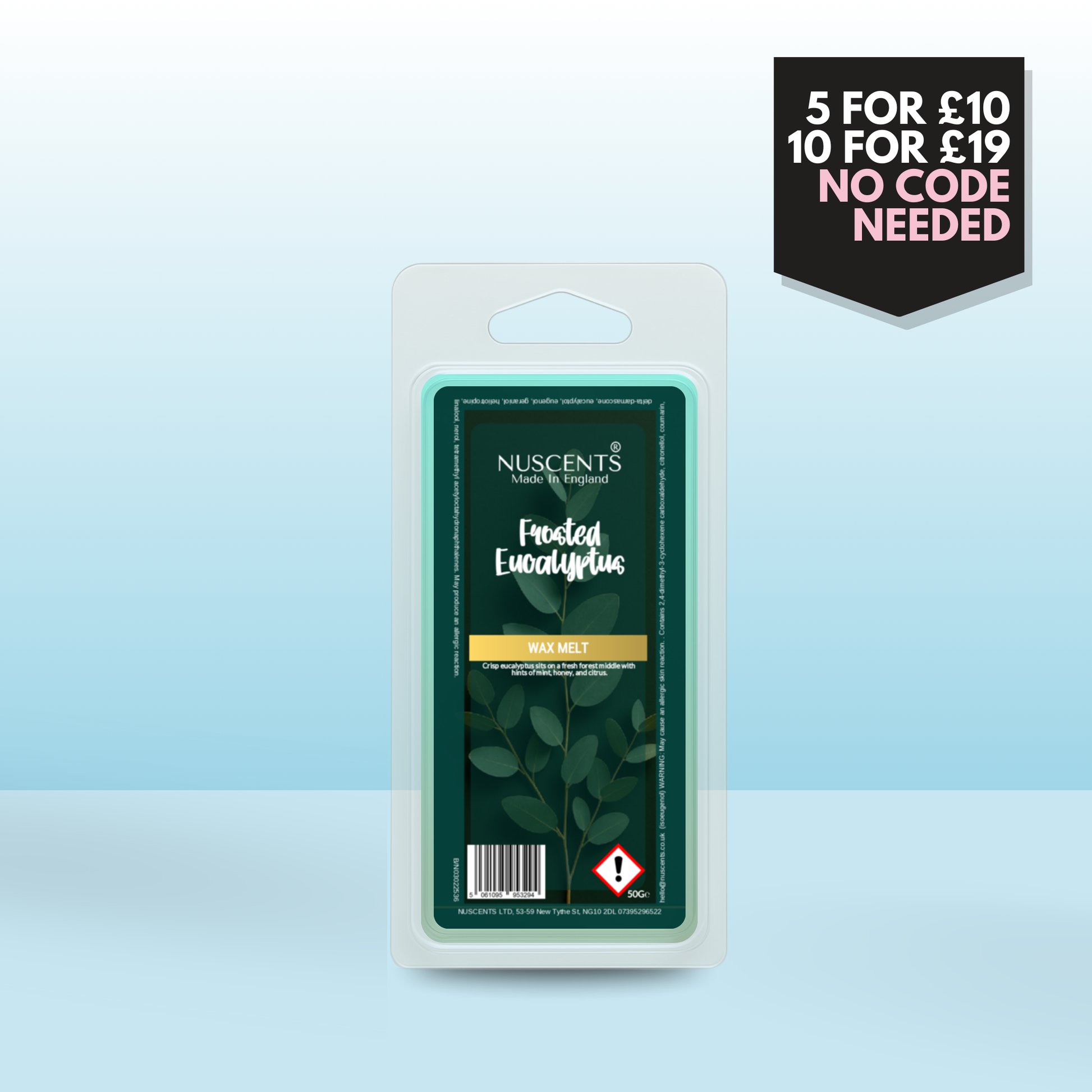 50g Frosted Eucalyptus Scented Wax Melt Poured with a full 10% fragrance load for a bold throw and designed to work in both tealight burners and higher-wattage electric warmers. Made In England.