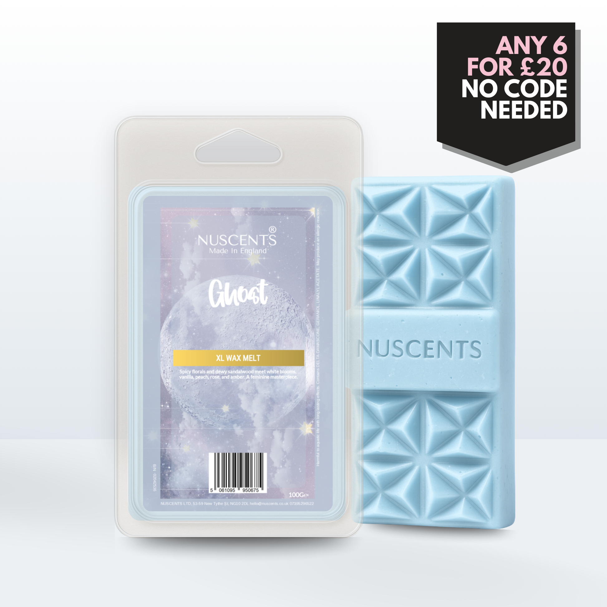 Ghost Wax Melt 100g XL A generous 100g wax melt - around twice the size of a standard wax melt - for incredible value and lasting fragrance. Contains multiple segments and large centrepiece wax chunk suitable for large wax warmers. Suitable for both tealight burners and higher-wattage electric warmers, each XL is poured with a full 10% fragrance load to give a strong, room-filling scent. The higher melting temperature ensures a slower release, so whilst early release is slower, you enjoy hours of fragrance from every piece.
