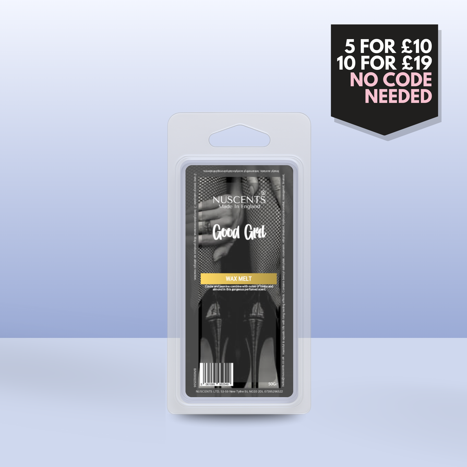 50g Good Girl Scented Wax Melt Poured with a full 10% fragrance load for a bold throw and designed to work in both tealight burners and higher-wattage electric warmers. Made In England.