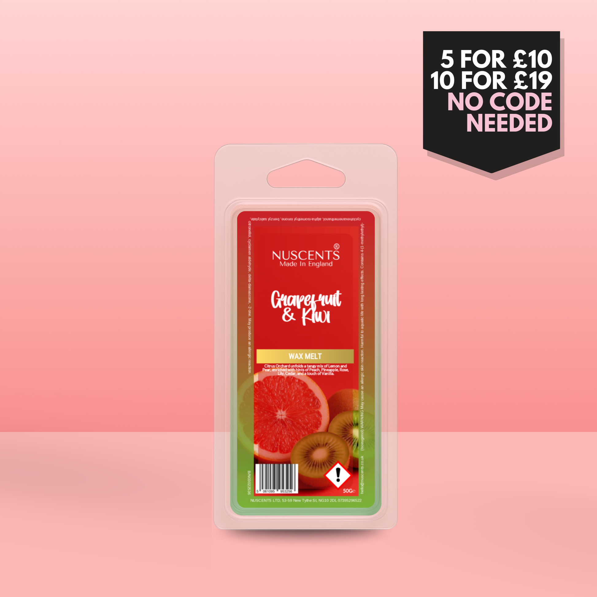 50g *LAST CHANCE Grapefruit & Kiwi Scented Wax Melt Poured with a full 10% fragrance load for a bold throw and designed to work in both tealight burners and higher-wattage electric warmers. Made In England.