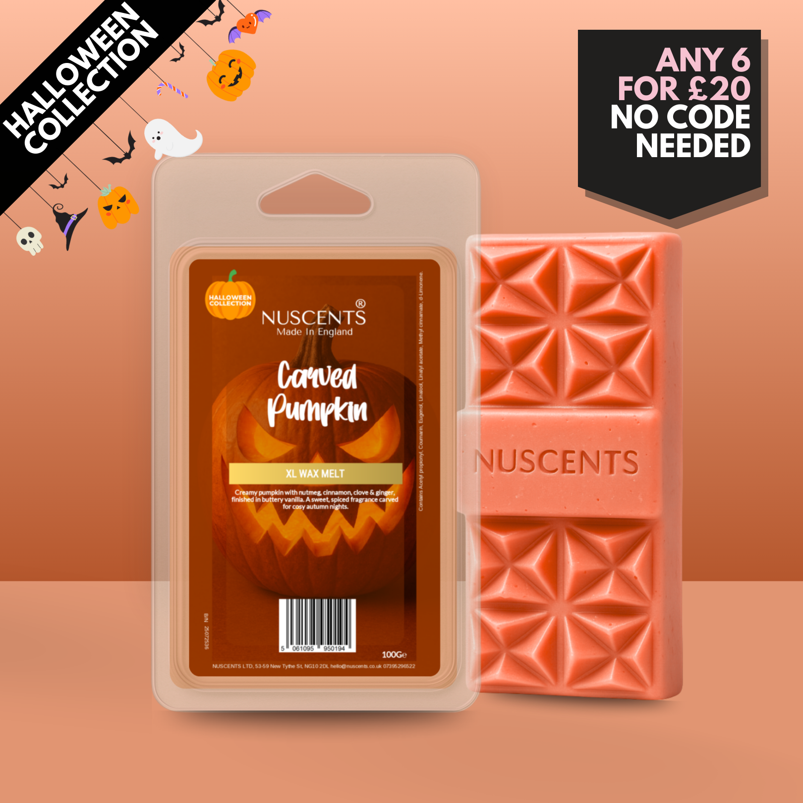 *Halloween Carved Pumpkin Wax Melt 100g XL A generous 100g wax melt - around twice the size of a standard wax melt - for incredible value and lasting fragrance. Contains multiple segments and large centrepiece wax chunk suitable for large wax warmers. Suitable for both tealight burners and higher-wattage electric warmers, each XL is poured with a full 10% fragrance load to give a strong, room-filling scent. The higher melting temperature ensures a slower release, so whilst early release is slower, you enjoy hours of fragrance from every piece.