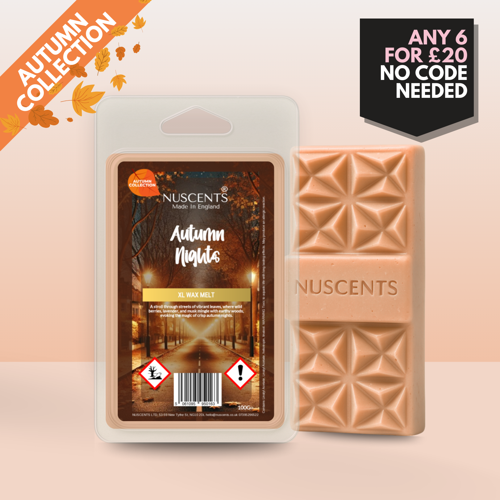 *AUTUMN Autumn Nights Wax Melt 100g XL A generous 100g wax melt - around twice the size of a standard wax melt - for incredible value and lasting fragrance. Contains multiple segments and large centrepiece wax chunk suitable for large wax warmers. Suitable for both tealight burners and higher-wattage electric warmers, each XL is poured with a full 10% fragrance load to give a strong, room-filling scent. The higher melting temperature ensures a slower release, so whilst early release is slower, you enjoy hours of fragrance from every piece.
