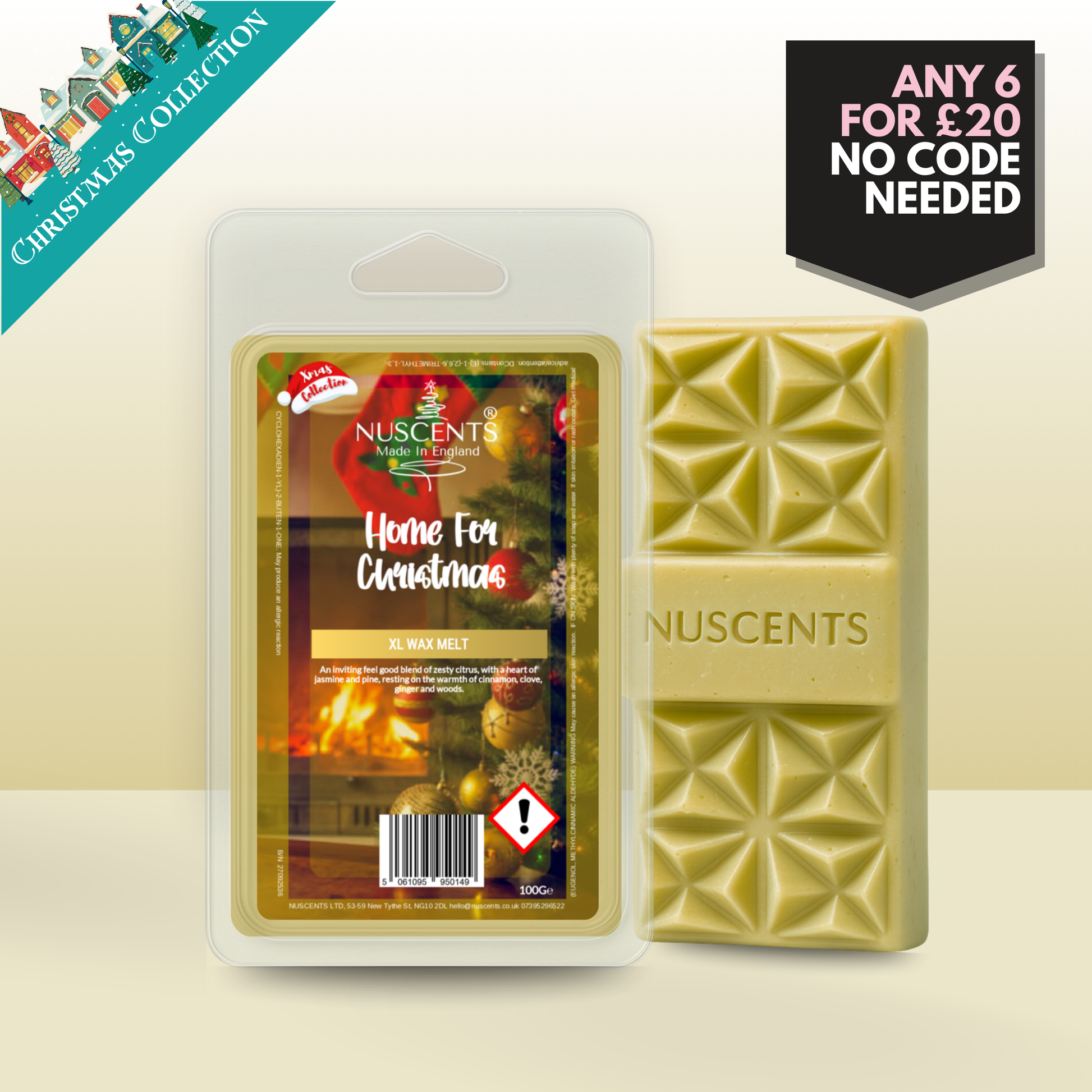 Home For Christmas Wax Melt 100g XL A generous 100g wax melt - around twice the size of a standard wax melt - for incredible value and lasting fragrance. Contains multiple segments and large centrepiece wax chunk suitable for large wax warmers. Suitable for both tealight burners and higher-wattage electric warmers, each XL is poured with a full 10% fragrance load to give a strong, room-filling scent. The higher melting temperature ensures a slower release, so whilst early release is slower, you enjoy hours of fragrance from every piece.