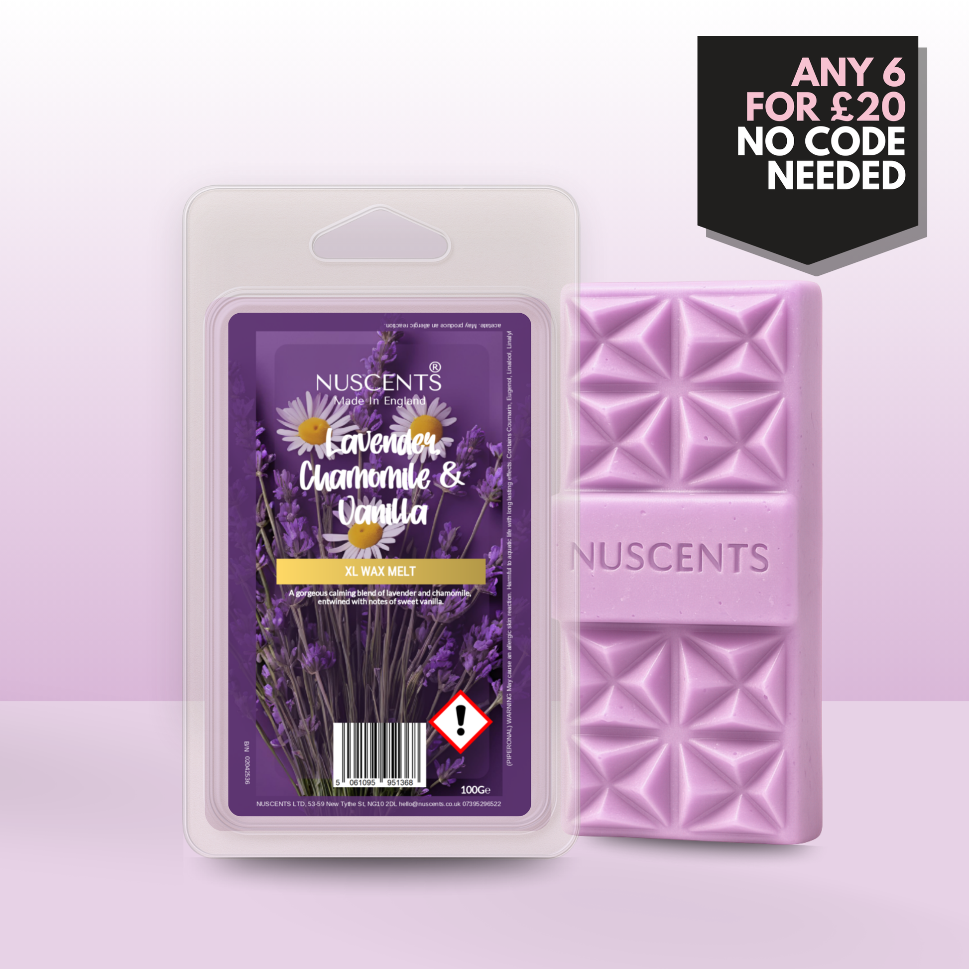 *LAST CHANCE Lavender, Chamomile & Vanilla Wax Melt 100g XL A generous 100g wax melt - around twice the size of a standard wax melt - for incredible value and lasting fragrance. Contains multiple segments and large centrepiece wax chunk suitable for large wax warmers. Suitable for both tealight burners and higher-wattage electric warmers, each XL is poured with a full 10% fragrance load to give a strong, room-filling scent. The higher melting temperature ensures a slower release, so whilst early release is slower, you enjoy hours of fragrance from every piece.