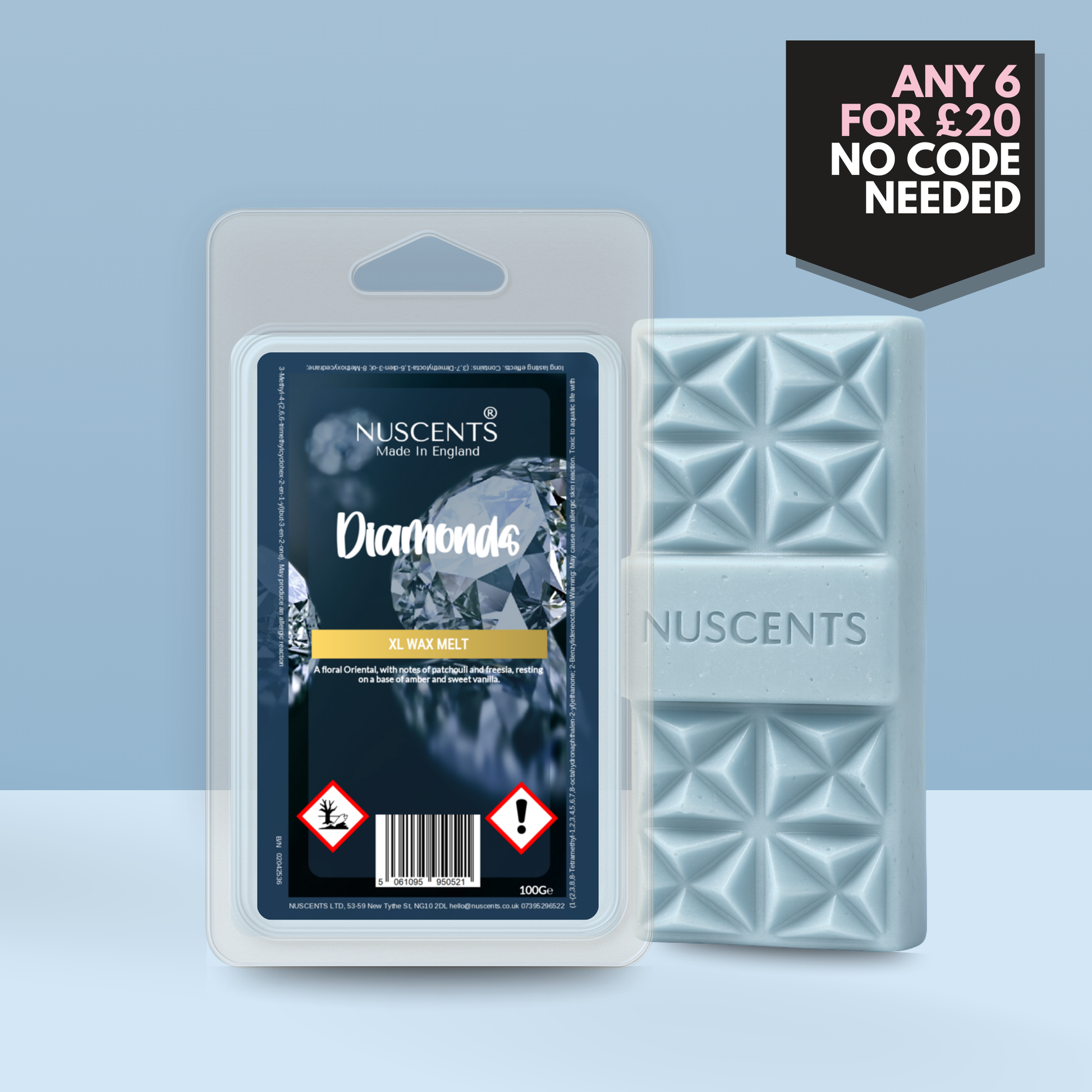 *LIMITED EDITION Diamonds Wax Melt 100g XL A generous 100g wax melt - around twice the size of a standard wax melt - for incredible value and lasting fragrance. Contains multiple segments and large centrepiece wax chunk suitable for large wax warmers. Suitable for both tealight burners and higher-wattage electric warmers, each XL is poured with a full 10% fragrance load to give a strong, room-filling scent. The higher melting temperature ensures a slower release, so whilst early release is slower, you enjoy hours of fragrance from every piece.