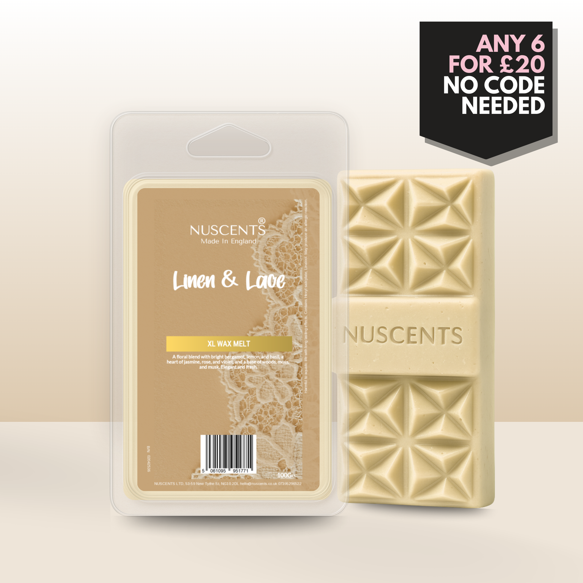 *LAST CHANCE Linen & Lace Wax Melt 100g XL A generous 100g wax melt - around twice the size of a standard wax melt - for incredible value and lasting fragrance. Contains multiple segments and large centrepiece wax chunk suitable for large wax warmers. Suitable for both tealight burners and higher-wattage electric warmers, each XL is poured with a full 10% fragrance load to give a strong, room-filling scent. The higher melting temperature ensures a slower release, so whilst early release is slower, you enjoy hours of fragrance from every piece.