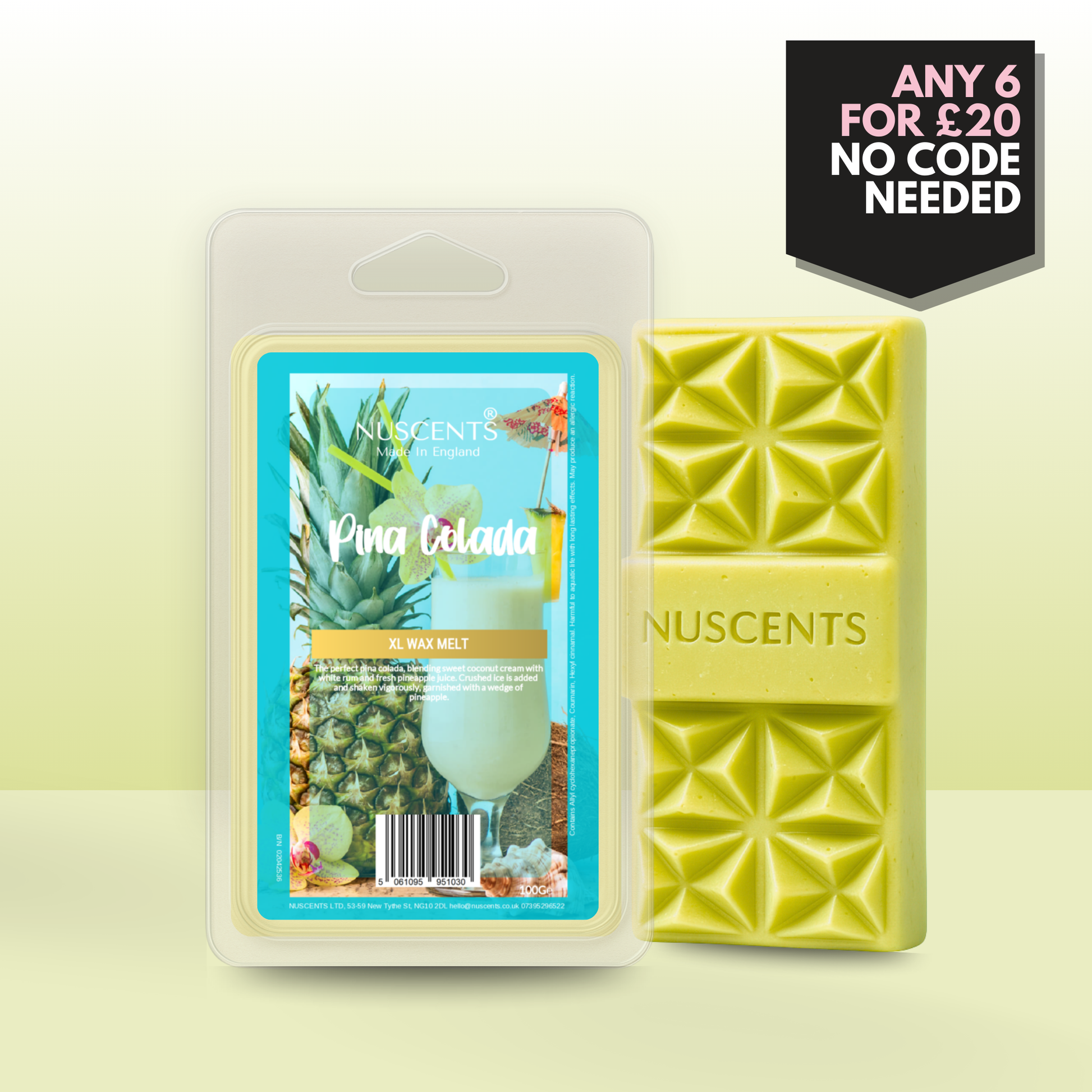 Pina Colada Wax Melt 100g XL A generous 100g wax melt - around twice the size of a standard wax melt - for incredible value and lasting fragrance. Contains multiple segments and large centrepiece wax chunk suitable for large wax warmers. Suitable for both tealight burners and higher-wattage electric warmers, each XL is poured with a full 10% fragrance load to give a strong, room-filling scent. The higher melting temperature ensures a slower release, so whilst early release is slower, you enjoy hours of fragrance from every piece.