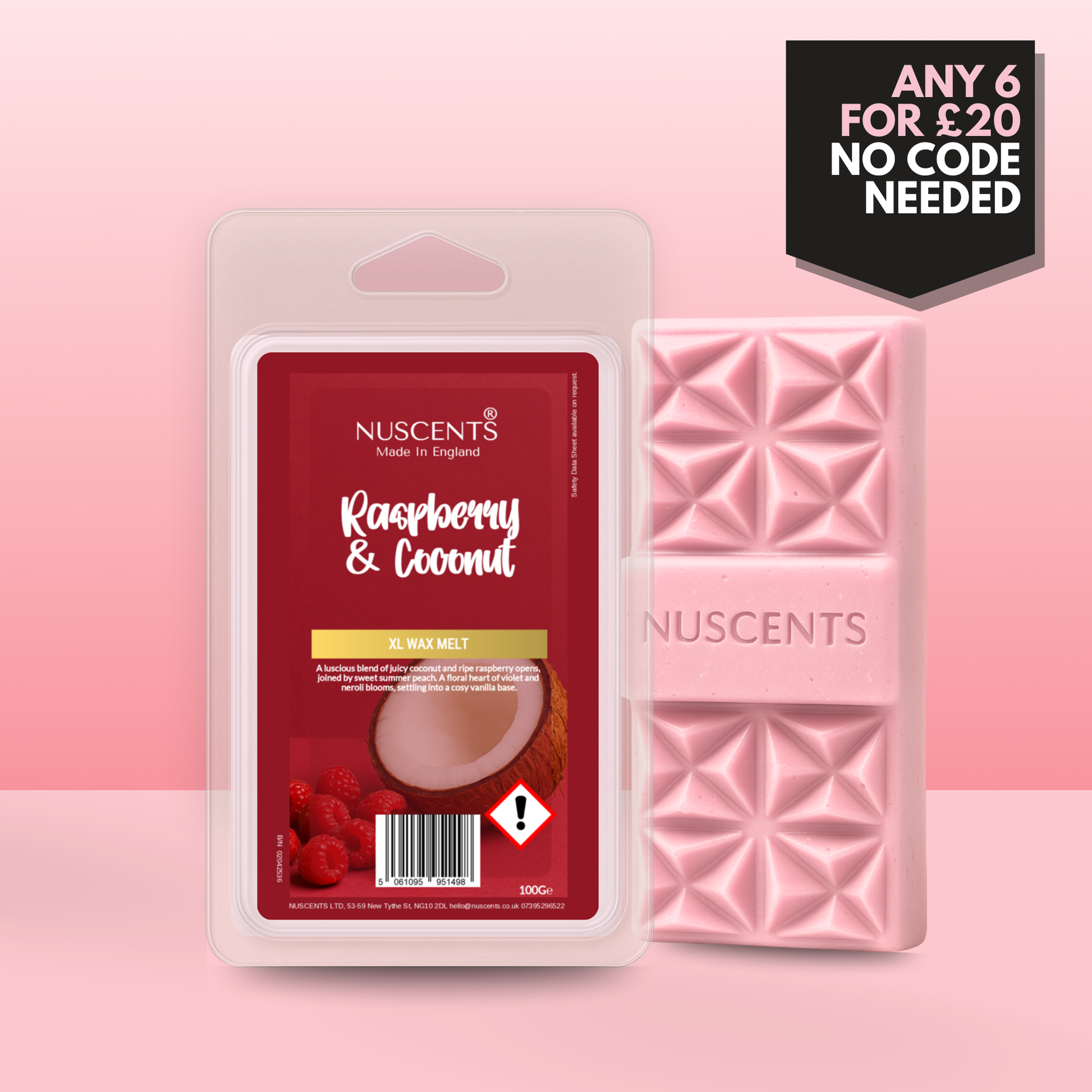 *LIMITED EDITION Raspberry & Coconut Wax Melt 100g XL A generous 100g wax melt - around twice the size of a standard wax melt - for incredible value and lasting fragrance. Contains multiple segments and large centrepiece wax chunk suitable for large wax warmers. Suitable for both tealight burners and higher-wattage electric warmers, each XL is poured with a full 10% fragrance load to give a strong, room-filling scent. The higher melting temperature ensures a slower release, so whilst early release is slower, you enjoy hours of fragrance from every piece.