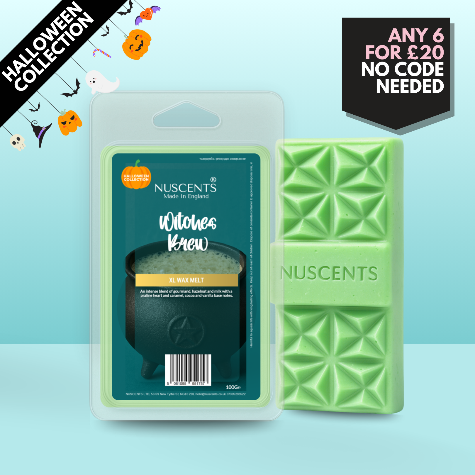 *Halloween Witches Brew Wax Melt 100g XL A generous 100g wax melt - around twice the size of a standard wax melt - for incredible value and lasting fragrance. Contains multiple segments and large centrepiece wax chunk suitable for large wax warmers. Suitable for both tealight burners and higher-wattage electric warmers, each XL is poured with a full 10% fragrance load to give a strong, room-filling scent. The higher melting temperature ensures a slower release, so whilst early release is slower, you enjoy hours of fragrance from every piece.
