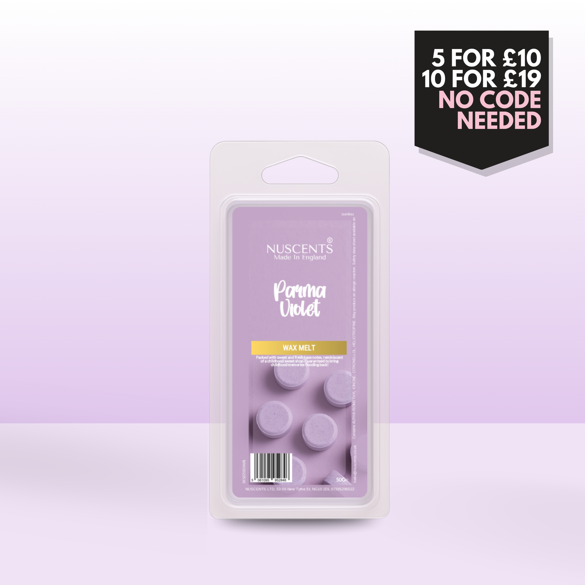 50g Parma Violet Scented Wax Melt Poured with a full 10% fragrance load for a bold throw and designed to work in both tealight burners and higher-wattage electric warmers. Made In England.