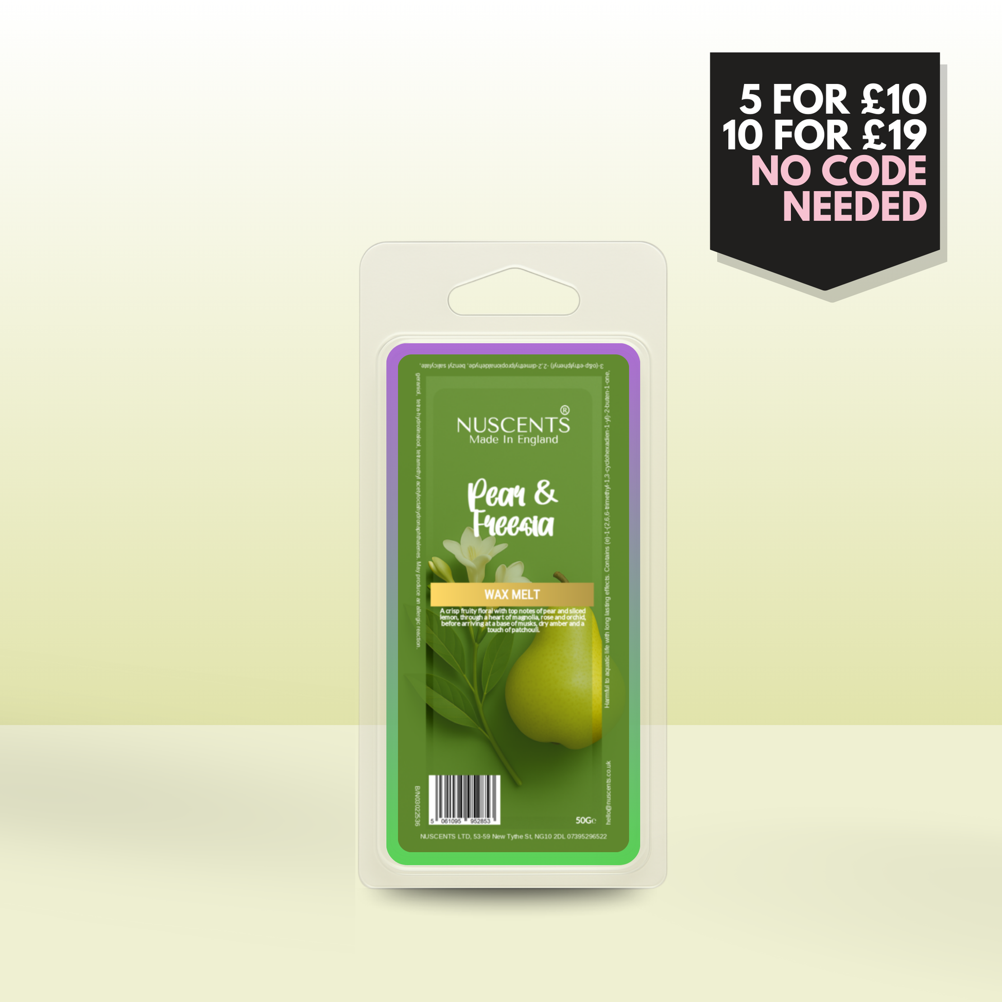 50g Pear & Freesia Scented Wax Melt Poured with a full 10% fragrance load for a bold throw and designed to work in both tealight burners and higher-wattage electric warmers. Made In England.