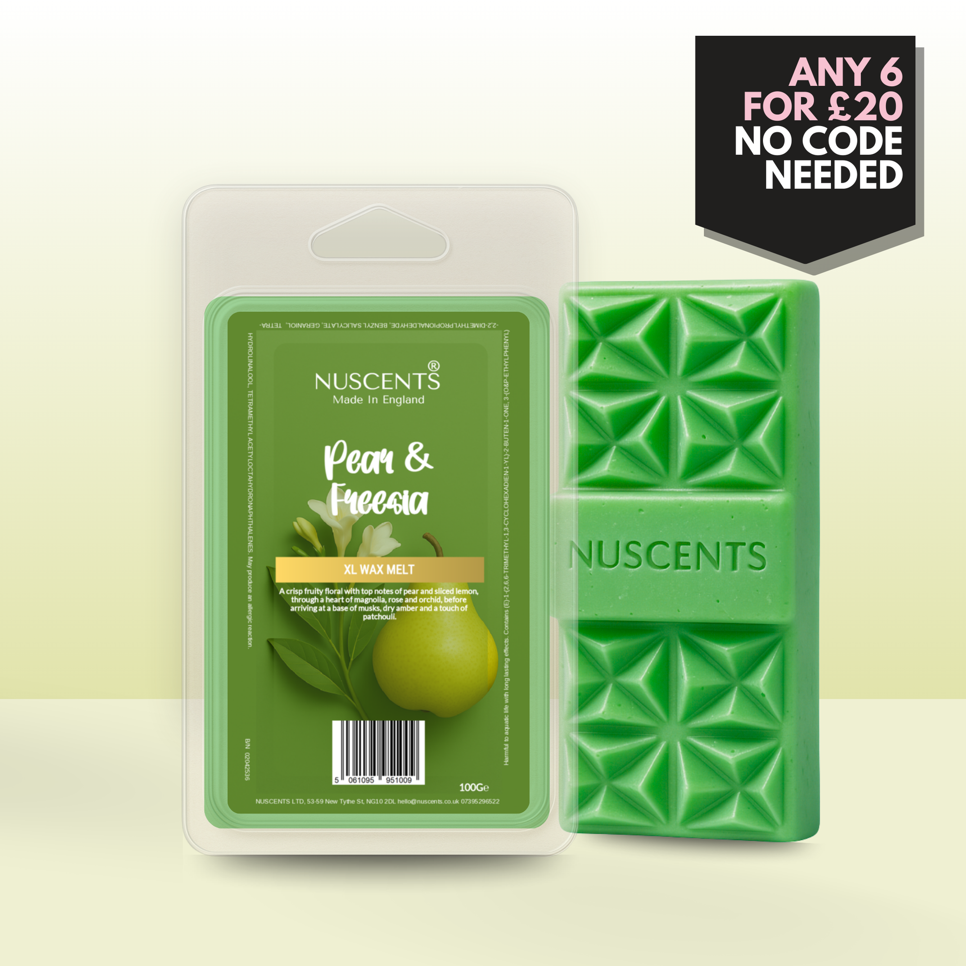 Pear & Freesia Wax Melt 100g XL A generous 100g wax melt - around twice the size of a standard wax melt - for incredible value and lasting fragrance. Contains multiple segments and large centrepiece wax chunk suitable for large wax warmers. Suitable for both tealight burners and higher-wattage electric warmers, each XL is poured with a full 10% fragrance load to give a strong, room-filling scent. The higher melting temperature ensures a slower release, so whilst early release is slower, you enjoy hours of fragrance from every piece.