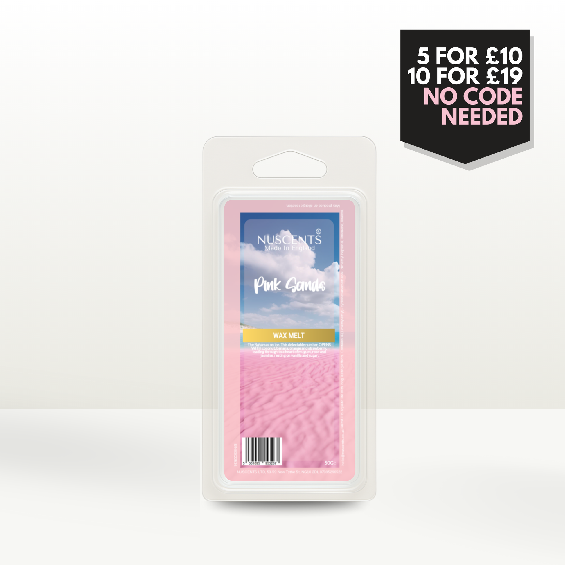 50g Pink Sands Scented Wax Melt Poured with a full 10% fragrance load for a bold throw and designed to work in both tealight burners and higher-wattage electric warmers. Made In England.
