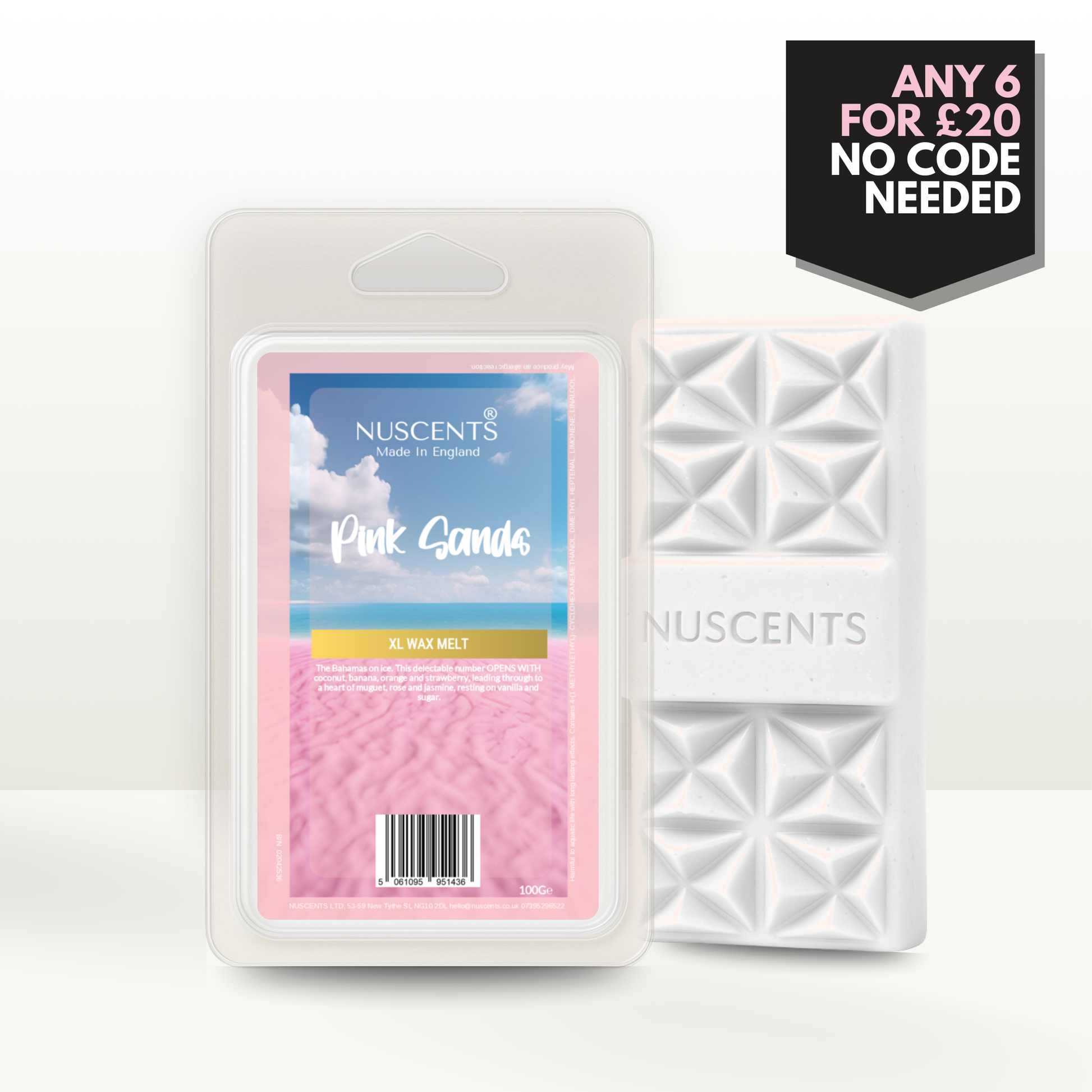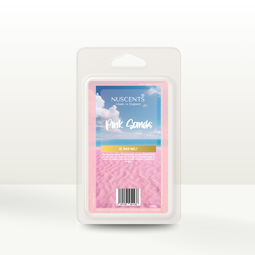 Pink Sands Wax Melt 100g XL A generous 100g wax melt - around twice the size of a standard wax melt - for incredible value and lasting fragrance. Contains multiple segments and large centrepiece wax chunk suitable for large wax warmers. Suitable for both tealight burners and higher-wattage electric warmers, each XL is poured with a full 10% fragrance load to give a strong, room-filling scent. The higher melting temperature ensures a slower release, so whilst early release is slower, you enjoy hours of fragrance from every piece.