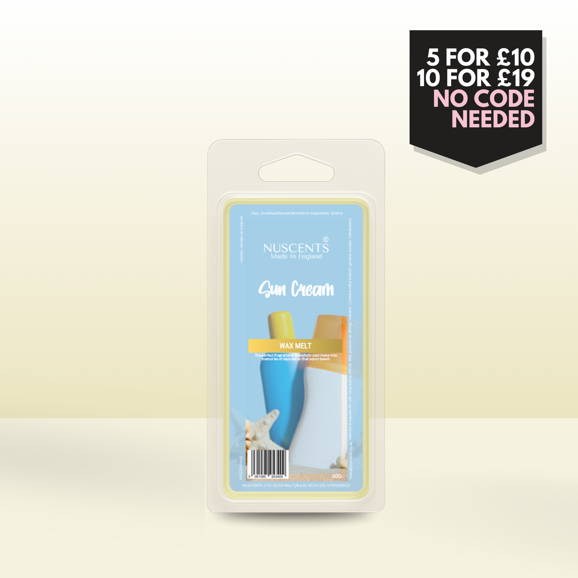 50g *LAST CHANCE Sun Cream Scented Wax Melt Poured with a full 10% fragrance load for a bold throw and designed to work in both tealight burners and higher-wattage electric warmers. Made In England.
