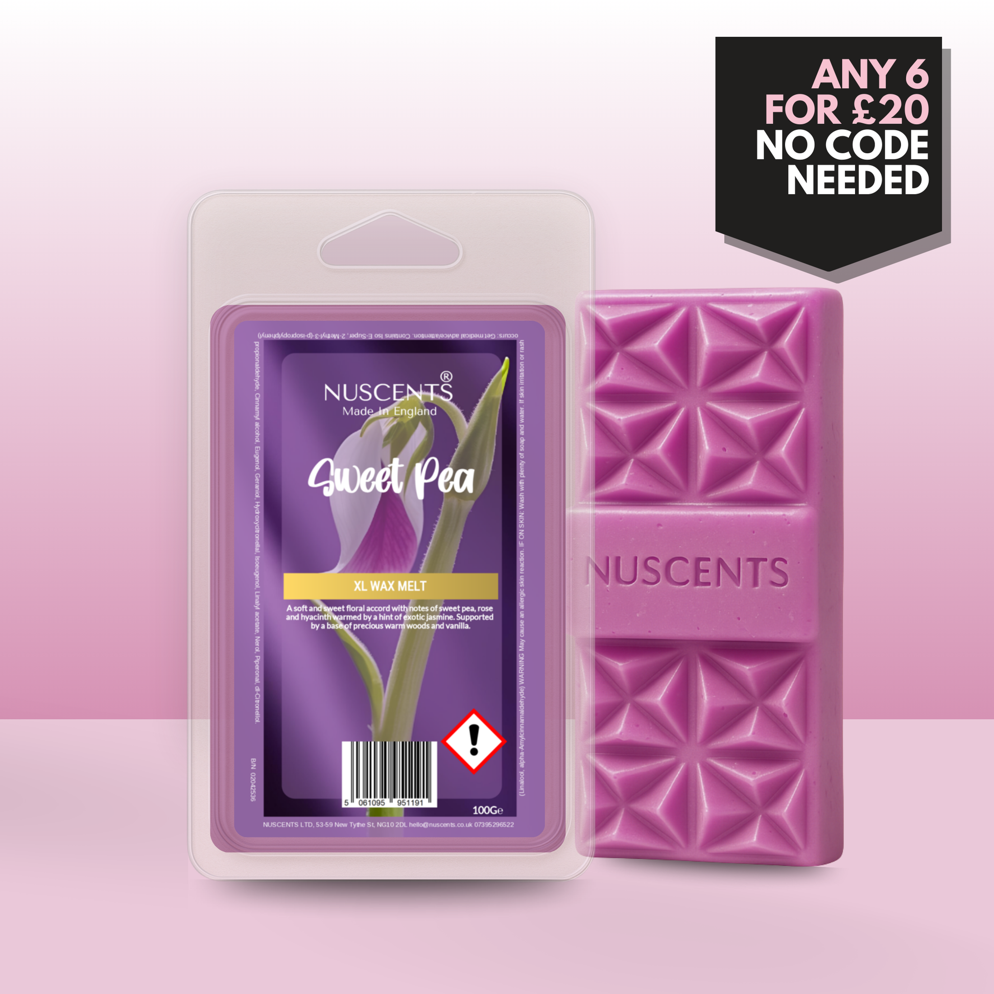 Sweet Pea Wax Melt 100g XL A generous 100g wax melt - around twice the size of a standard wax melt - for incredible value and lasting fragrance. Contains multiple segments and large centrepiece wax chunk suitable for large wax warmers. Suitable for both tealight burners and higher-wattage electric warmers, each XL is poured with a full 10% fragrance load to give a strong, room-filling scent. The higher melting temperature ensures a slower release, so whilst early release is slower, you enjoy hours of fragrance from every piece.